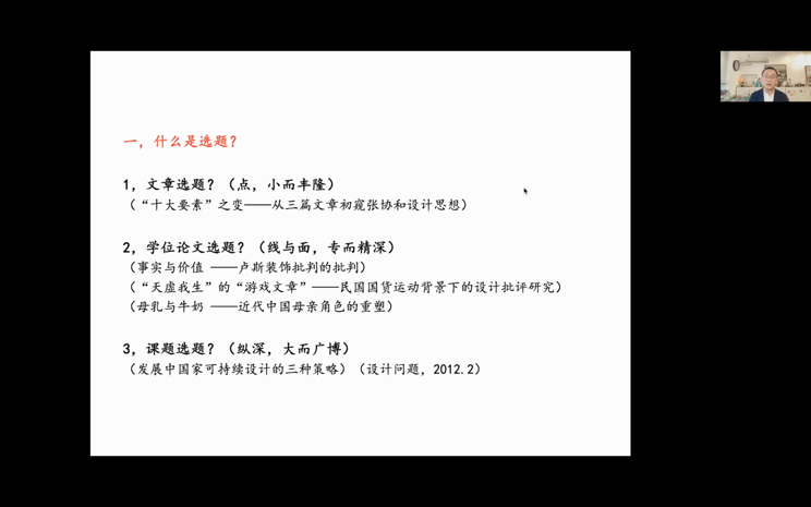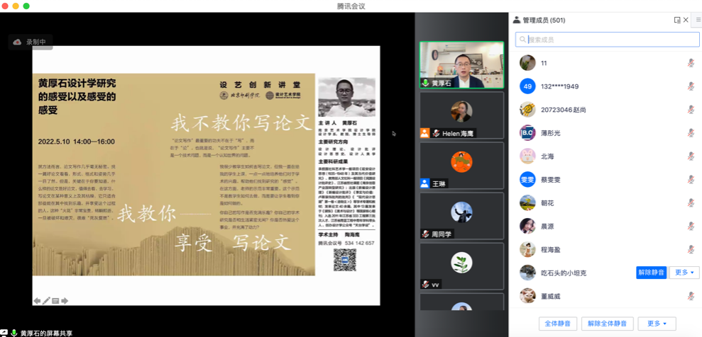 为进一步营造优良学术气氛,提升研究生和学院教师论文写作水平,5月10日下午,设计艺术学院特邀南京艺术学院黄厚石教授为学院师生带来一场以“我不教你写论文,我教你享受写论文——黄厚石设计学研究的感受以及感受的感受”为题的学术讲座。此次讲座由设计艺术学院副院长陶海鹰主持,通过线上会议和直播的形式开展,超过500人参与,气氛十分热烈。