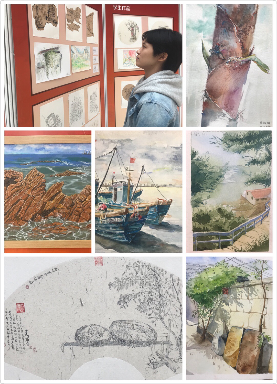 此次2016级写生实习课程师生优秀作品展是设计艺术学院在积极探索红色教育进课堂教学方式改革成果展示,师生们在课程中走进全国著名的"爱国主义教育基地"威海刘公岛中国甲午战争博物院、旗顶山炮台、东泓炮台、铁码头等教育景点,走进山东省著名爱国主义教育基地青岛市博物馆,并重点参观了爱国教育相关展厅,开展了一场踏寻红色遗迹,重温传统教育写生之旅。本次展览的作品是由历年参加写生实习课程的教师和2016级设计艺术学院﹑新媒体学院写生实习课程的同学从近万张作品中精选的500多幅师生优秀写生作品和采风图片。参展作品涉及速写、水粉画、水彩画,丙烯、摄影和油画多种艺术形式,全方位的展示了本年度艺术专业写生实习课程的教学成果及学生的学习情况。