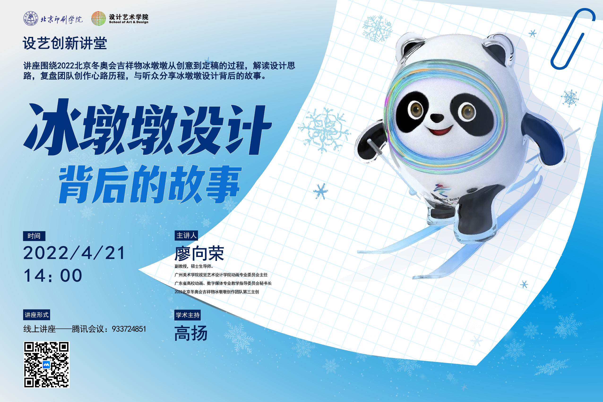 2022年4月21日下午2:00,设计艺术学院面对全体本科生和研究生开展“冰墩墩设计背后的故事”主题讲座。本次设艺创新讲堂邀请广州美术学院视觉艺术设计学院院长助理,动画专业委员会主任,2022北京冬奥会吉祥物冰墩墩创作团队第三主创,广州美术学院视觉艺术设计学院副教授、硕士生导师廖向荣老师开讲,讲座由设计艺术学院艺术与科技专业讲师高扬主持。
