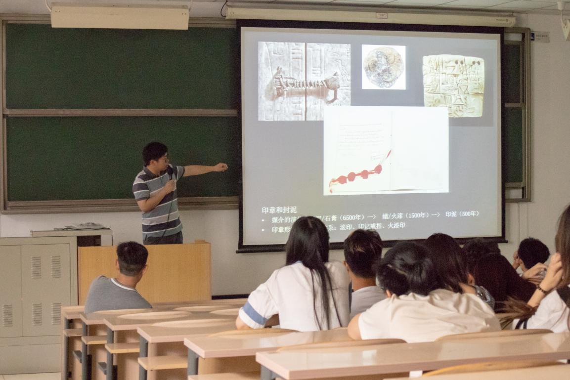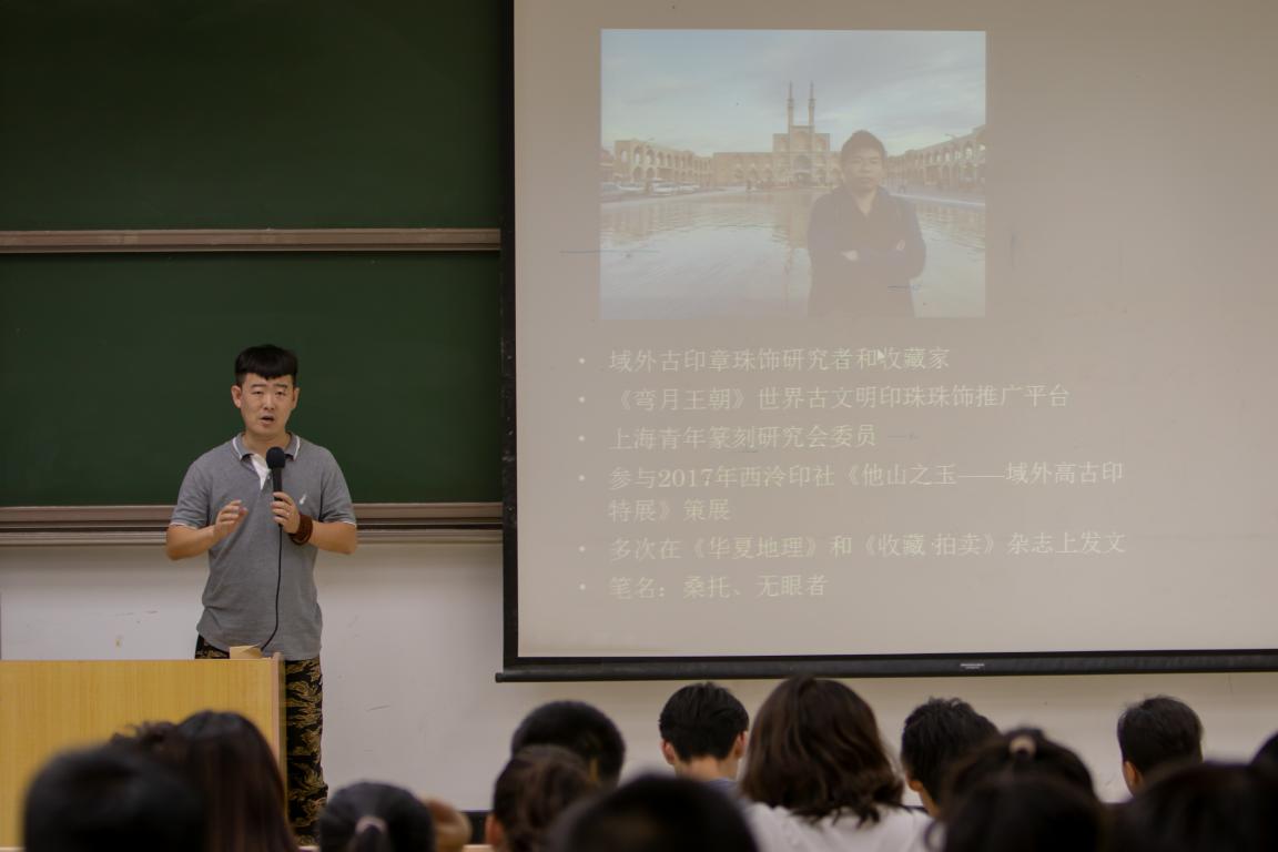 讲座的内容主要介绍古代东西方的图形艺术,对其展开讨论及历史探源。吴佳玮老师从自身的阅历、工作和研究经历谈起,讲到了从华夏大地开始,到进入西域及西域文化的“新势力”、波斯的文化与信仰和最后的罗马的三世纪危机和新的格局,并且由此出发,谈及了自己对于古代西方印章艺术中的异同的见解。