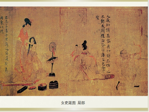 课程设计了多个契合点进行思政元素深度融合。首先东晋画家顾恺之创作的《女史箴图》就是一幅反映人物画风貌的成功典范,它以女性作为绘画创作题材,通过反映女性的生活状态,它充分发挥传统的教化功能。宣扬妇女德行为内容,劝戒嫔妃们要修德养性,树立高尚的道德品质。其次是《列女仁智图》描绘了15个列女故事,既是出于宫廷政治斗争的需要,同时也是为了在社会上广泛推行妇女的道德教育,这样的作品可以激发学生提升学生自身修养,树立高尚品德。