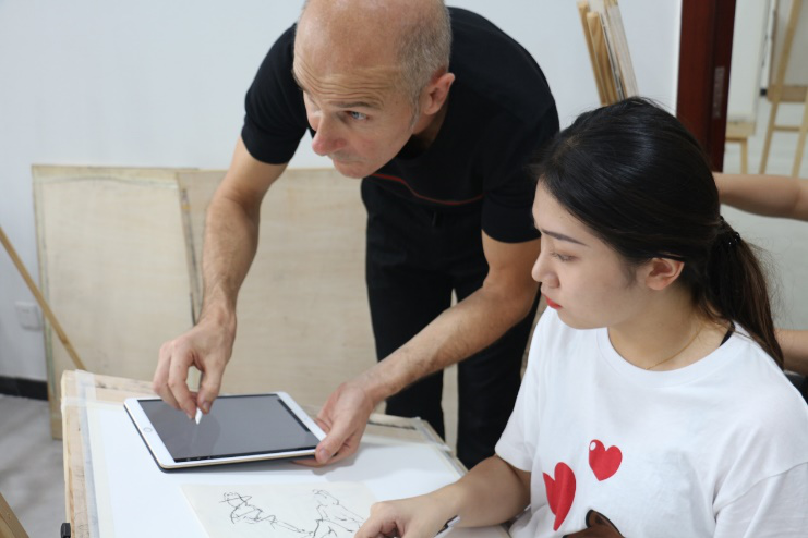 2018年9月10日,法国高等实用艺术学院的米歇尔·洛里切拉教授和夫人马加利·卡佐教授受设计艺术学院邀请来校进行学术教学活动交流,活动由设计艺术学院张晓东副院长策划,上午为绘画理论课程讲授环节,下午为现场示范教学及辅导,课程主持为绘画专业牛明明老师、周璐老师。
