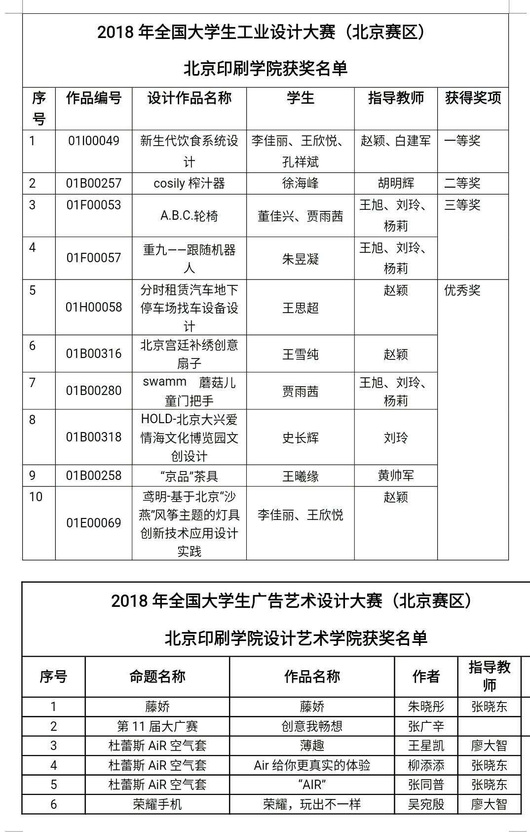 全国大学生工业设计大赛(北京赛区)及全国大学生广告艺术大赛(北京赛区)均由北京市教委主办,获奖作品将被送往全国赛区参与全国赛角逐。具体获奖名单如下: