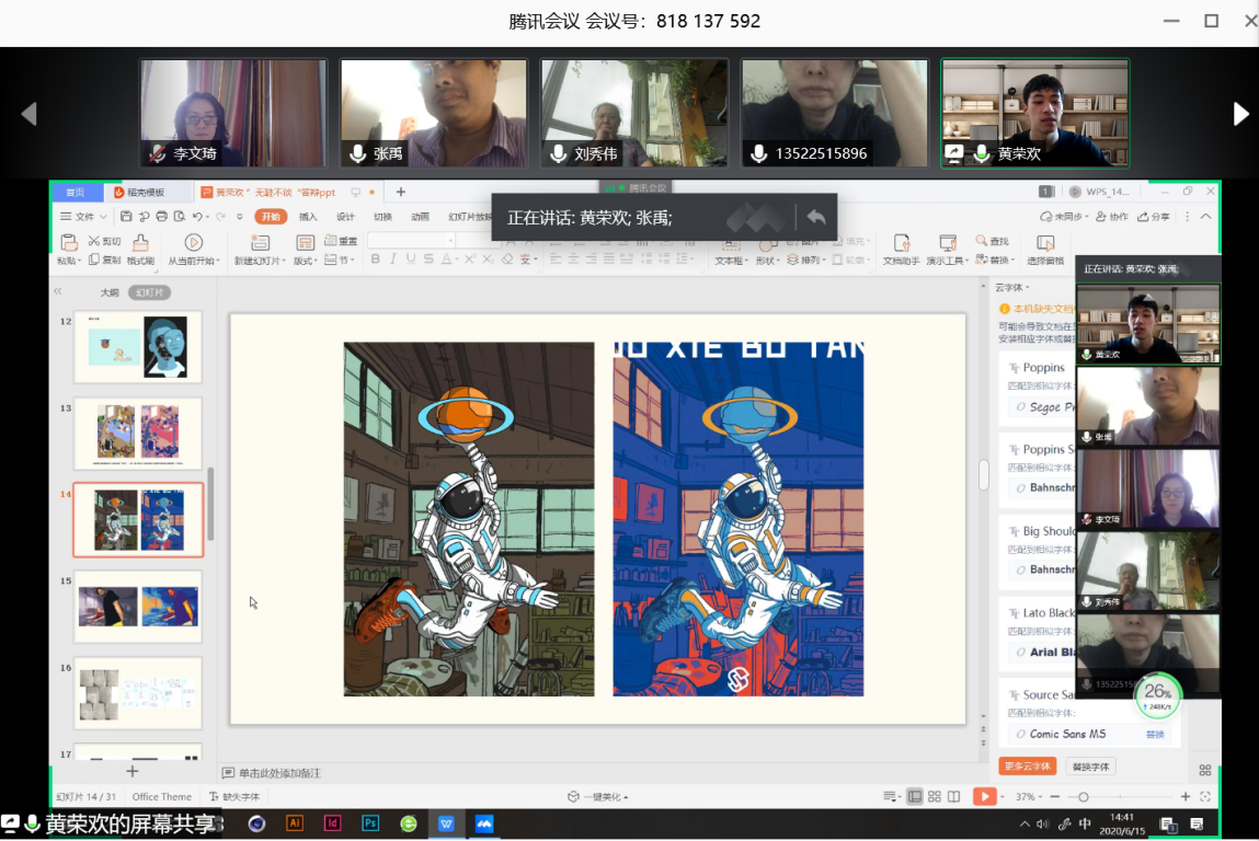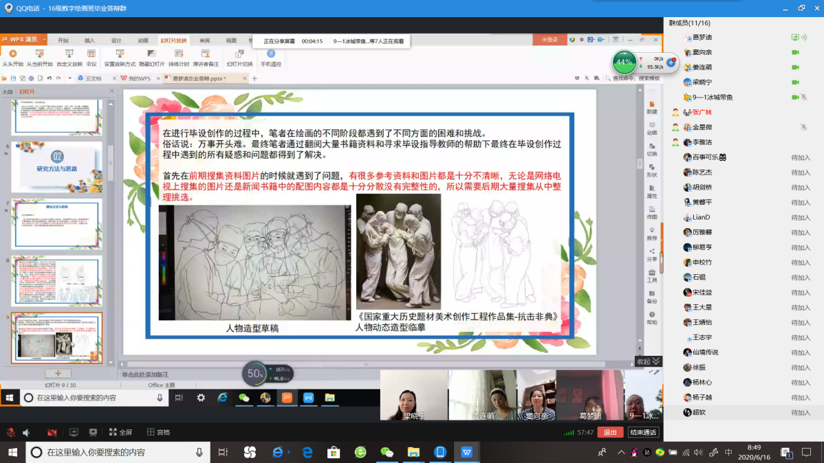 此次答辩,分为9个会场进行,采取师生通过腾讯会议、钉钉、QQ屏幕分享等的方式进行网络线上答辩。会前,各答辩组教师给每位学生进行了网络测试。答辩过程一切正常,学生们对答辩准备认真充分,从最终完成的作品看,达到了预期的目标。答辩中,部分学生作品选题新颖、贴近当前社会现状及研究热点,特别是表现当前抗击疫情、中国传统文化故事、红色主题、家乡建设发展等方面的作品有着很好的表现。毕业设计创作报告完成情况良好。评委严谨认真,提问以引导性为主,让学生把自己的水平、能力、风貌展现出来,既有深度也有广度,在给予学生们肯定的同时也提出来一些建议,希望同学们日后能有更深入的思考和研究。经过两天紧张的答辩,圆满完成了此项工作。