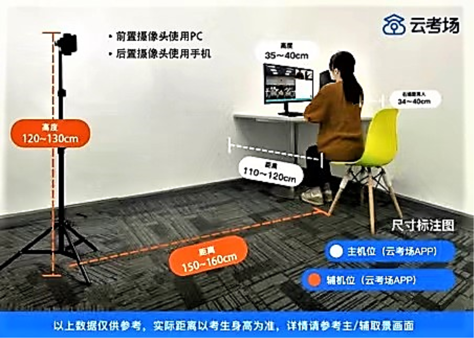 (6)考生须准备两个机位,第一机位为主机位,学生面部正对屏幕,要求选择台式电脑、笔记本电脑;第二机位为副机位,位于学生背面或侧面,影像覆盖到学生上半身、双手臂和外部环境,要求手机(设为飞行模式,连接WiFi)或电脑。
