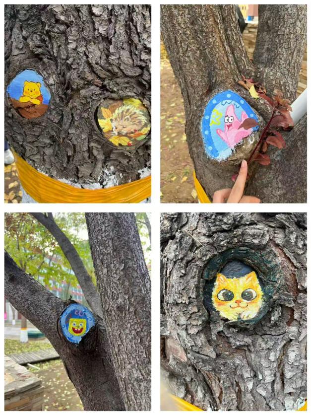 面对校园树木的疤痕,设计艺术学院的党员同学们以专业视角切入,将平面设计、插画创作等技能融入实践。活动设计了“森林小伙伴”“经典动画”等系列主题,同学们巧妙结合树木的纹理与伤疤形态,将其转化为灵动的艺术形象。原本单调的树干,在同学们的创意画笔下,披上了“萌趣外衣”,焕发出温暖而富有故事感的艺术气息。“每一道树疤都是树木生长的印记,用画笔治愈它们的‘伤口’,不仅是专业实践,更是情感的传递。我们希望通过艺术表达对自然的尊重、对校园的热爱。”一名参与活动的研究生党员如是说。从构思草图到调色绘画,学子们不仅深化了专业技能,更在实践中体会到“化残缺为美”的艺术哲学。