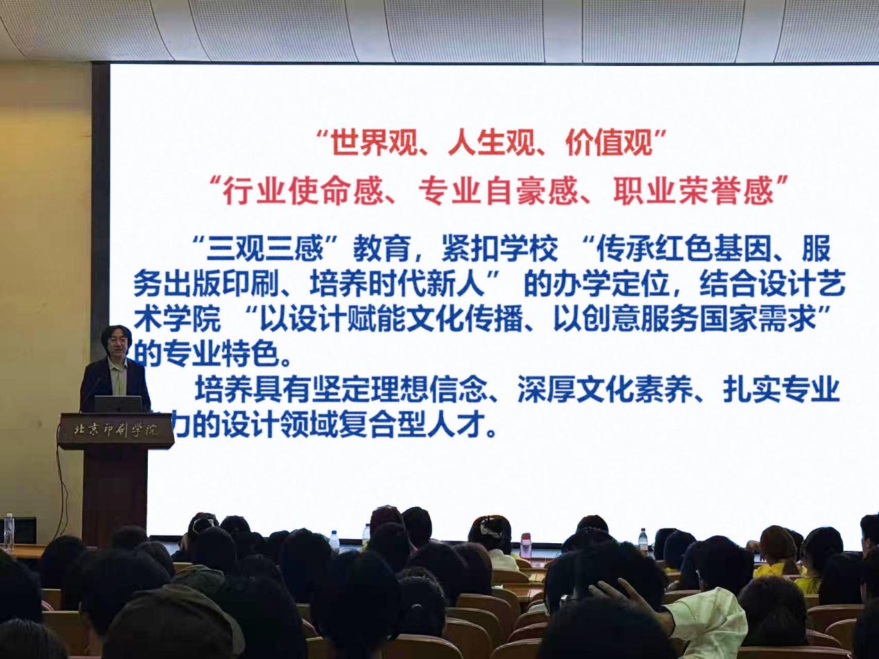 最后,张晓东院长以世界观、人生观、价值观“三观”以及行业使命感、专业自豪感、职业荣誉感“三感”为落脚点,指出“三观三感”教育,紧扣学校“传承红色基因、服务出版印刷、培养时代新人”的办学定位,结合设计艺术学院“以设计赋能文化传播、以创意服务国家需要”的专业特色,对同学们提出四点期望,一是要心怀家国、志存高远,坚守奉献国家、服务人民的底色;二是要坚守文化报国使命,关注并致力于服务行业和北京发展;三是要开拓视野,发掘探索的欲望与创作的激情;四是要瞄准学科前沿,不断夯实专业学养。
