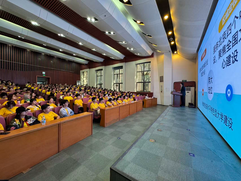 为帮助新生锚定奋斗方向、融入大学生活,引导新生树立正确的世界观、人生观和价值观,激发行业使命感、专业自豪感和职业荣誉感,9月17日下午,设计艺术学院举行2025级本科新生“三观三感”教育启动课暨“院长公开课”。设计艺术学院院长张晓东、2025级辅导员董琪琪以及全体本科新生参加,课程持续近3个小时。公开课由辅导员董琪琪主持。