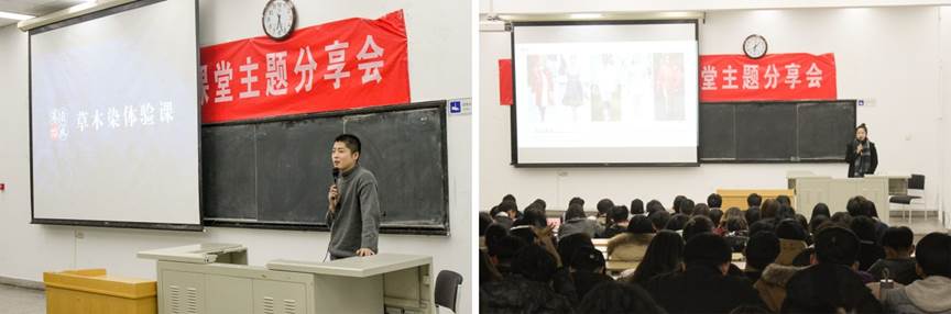 于季琦结合自己在校学习的经验从灵感来源,色彩提取,面料,效果图,制版,立裁等多方面详细的讲述了服装设计步骤,且就如何进行服装设计提出了建设性建议。刘攀则结合传统工艺草木染工艺来进行介绍。从草木染的来源,颜料的提取,艺染工艺方面进行了介绍。