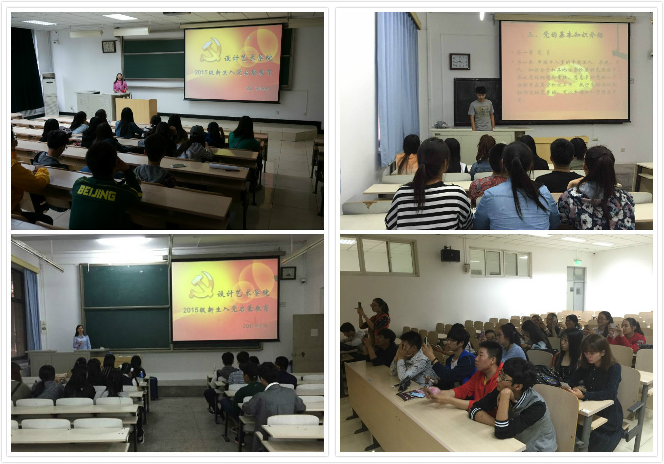 设计艺术学院13-14级学生党支部的学生党员作为各班新生辅导员,分别从"在大学生中发展党员的重要意义"、"端正入党动机"、"设计艺术学院学生党组织、党员基本情况"、"入党基本流程"以及"入党申请书和思想汇报的写作规范"等几个方面为本班新生做了详细地讲解。