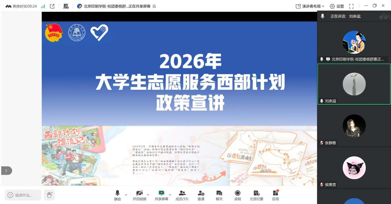 为引导青年学子厚植家国情怀、勇担时代使命,鼓励应届毕业生奔赴西部、扎根基层,主动将个人成长融入国家发展大局,3月25日下午,设计艺术学院组织线上大学生志愿服务西部计划线上分享会。学校团委兼职副书记杨舒惠同学担任主讲人,设计艺术学院分团委书记、2026届本科毕业生辅导员刘余溢及本科毕业生参加线上分享。