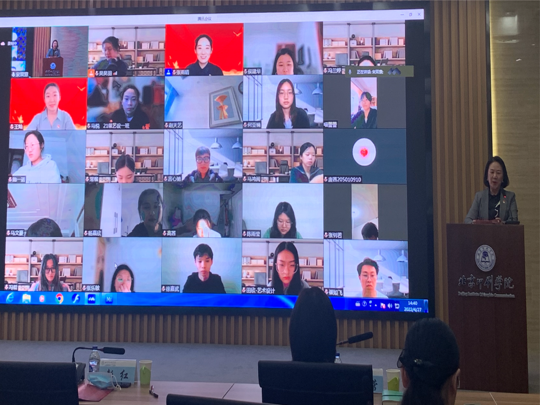 在最后总结讲话中,彭红与线上党员同学们进行了亲切问候与交流。她对设计艺术学院策划举办的这样一个能够体现立德树人根本任务、展示设艺品牌的活动表示了充分肯定。并结合学校今年的工作重点为活动进一步指明了方向。彭红与大家重温了学校在冬奥中做出的各项贡献,希望同学们能将胸怀大局、自信开放、 迎难而上、追求卓越、共创未来的北京冬奥精神用心融入到自己的生活学习中。彭书结合习近平在中国人民大学的讲话,提出党员同学们也要能在实践中、在课堂中讲好思政课。她讲道学生党员是青年中最优秀的一部分,要将光荣的传统和红色基因、红色血脉深深刻在文化血脉中、文化特征中和文化时代标记里,向前辈学习,努力做好社会主义核心价值观坚定的信仰者、坚定传播者和模范践行者。百年梦很艰巨,文化强国的担子很重,新时代的青年要实现民族的伟大复兴,我们面临百年未有之大变局,党员同学们要能用脚步丈量祖国大地,用眼睛发现中国的精神,用耳朵倾听人民呼声,用内心感应时代脉搏,把对祖国血浓于水、与人民同呼吸共命运的情感贯穿学业全过程中。在启动仪式的结尾,彭书记预祝大家五四青年节快乐。