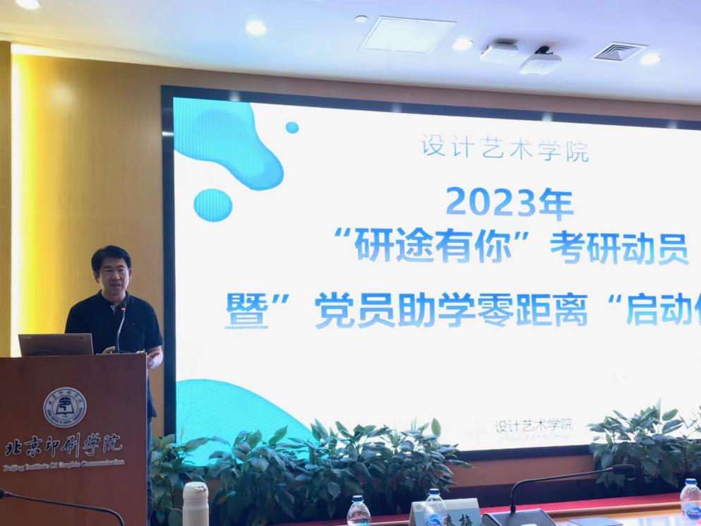5月24日下午,北京印刷学院设计艺术学院2023年“研途有你”考研动员暨“党员助学零距离”启动仪式在新创大厦学术交流中心第一会议室顺利举行。本次参加仪式人员有,教务处副处长史河,研究生副院长鲁春梅,设计艺术学院党委书记史民峰,设计艺术学院院长张晓东,设计艺术学院党委副书记王蕊,设计艺术学院副院长杨大禹,2023届年考研成功学生代表,21级全体学生。仪式由20级辅导员董琪琪主持。