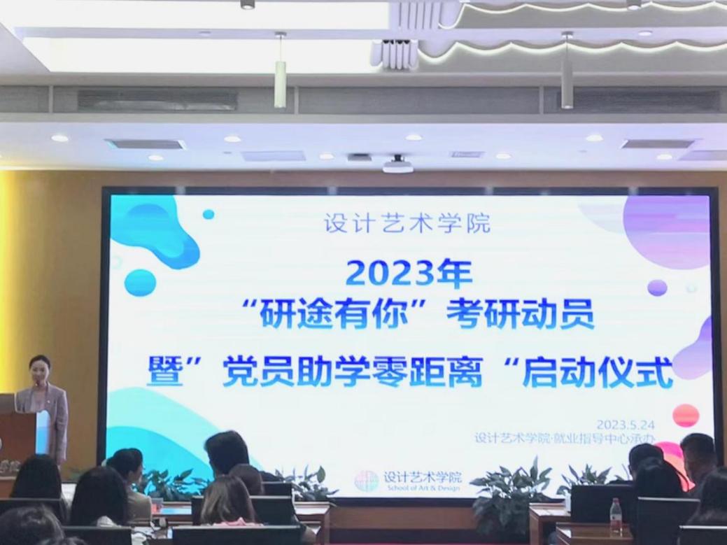 设计艺术学院党委副书记王蕊向大家说明了党员助学零距离即考上本校研究生的党员与考本校的同学结成帮扶小组,进行随时的答疑解惑,并宣布“党员助学零距离”工程启动,最后她借用李白的诗句“大鹏一日同风起,扶摇直上九万里”来预祝大家考研成功。