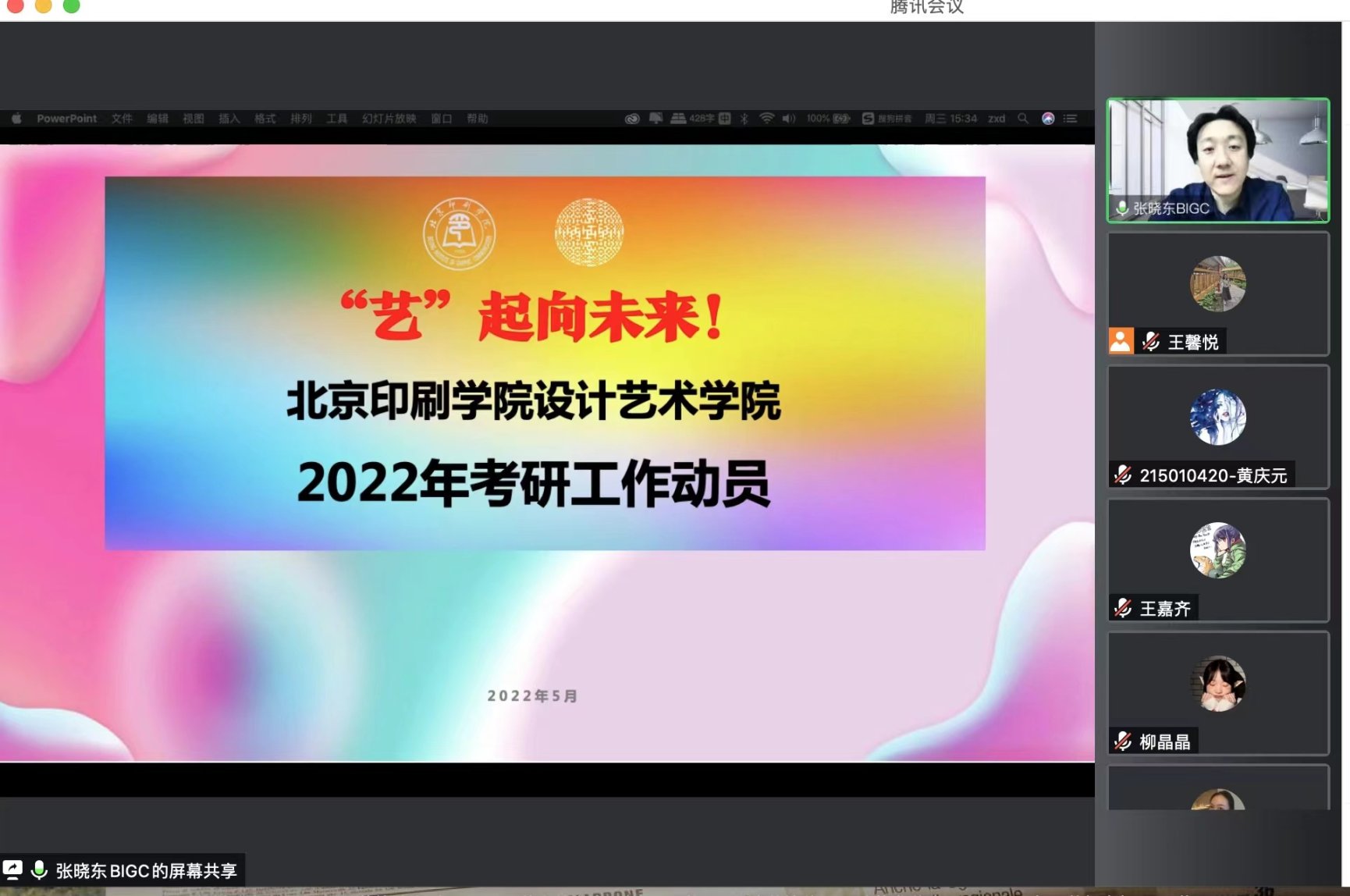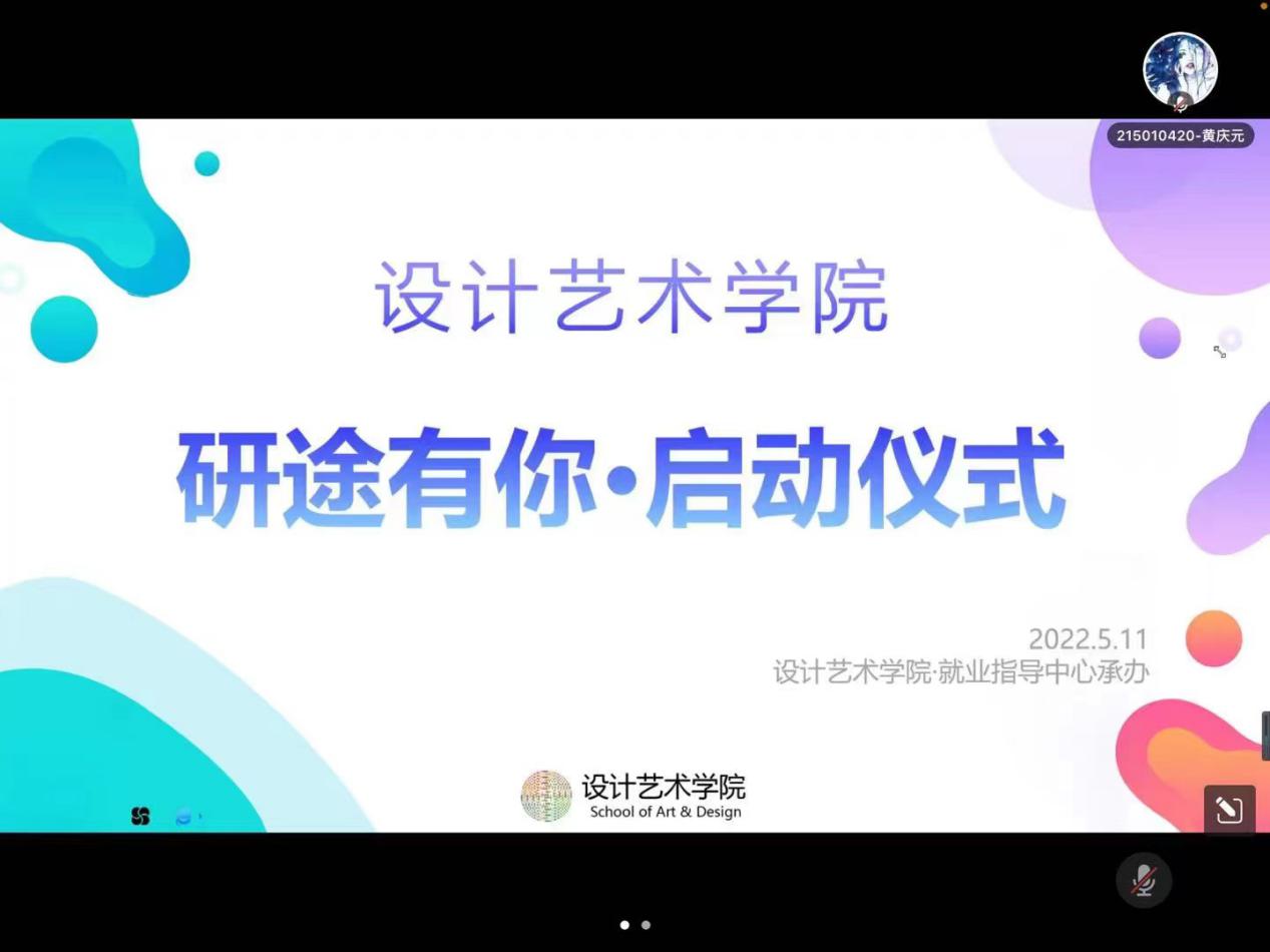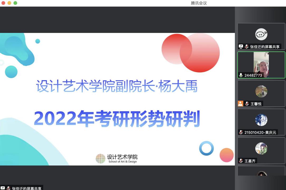 为了更好地落实就业育人,助力2019级本科生考研,5月11日下午,设计艺术学院通过线上会议的形式开展了2022年“研途有你”启动仪式。设计艺术学院全体领导班子、2019级本科生辅导员、2019级全体考研学生参会,会议由学生工作组组长王馨悦主持。