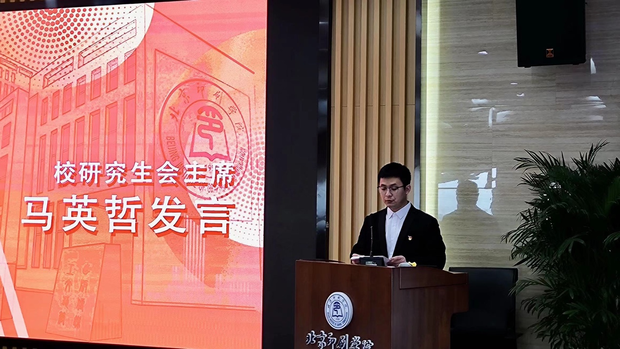 北京印刷学院研究生会主席马英哲对设计艺术学院研究生会的成立表示深切的祝贺,并希望校研究生会与设计艺术学院研究生会今后密切交流与合作。