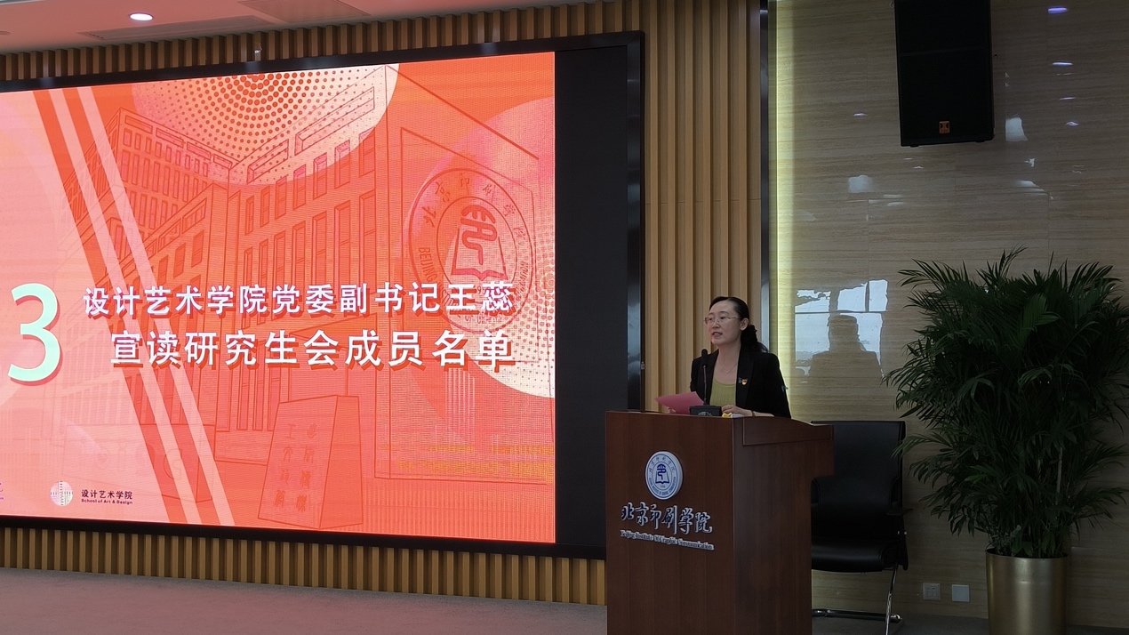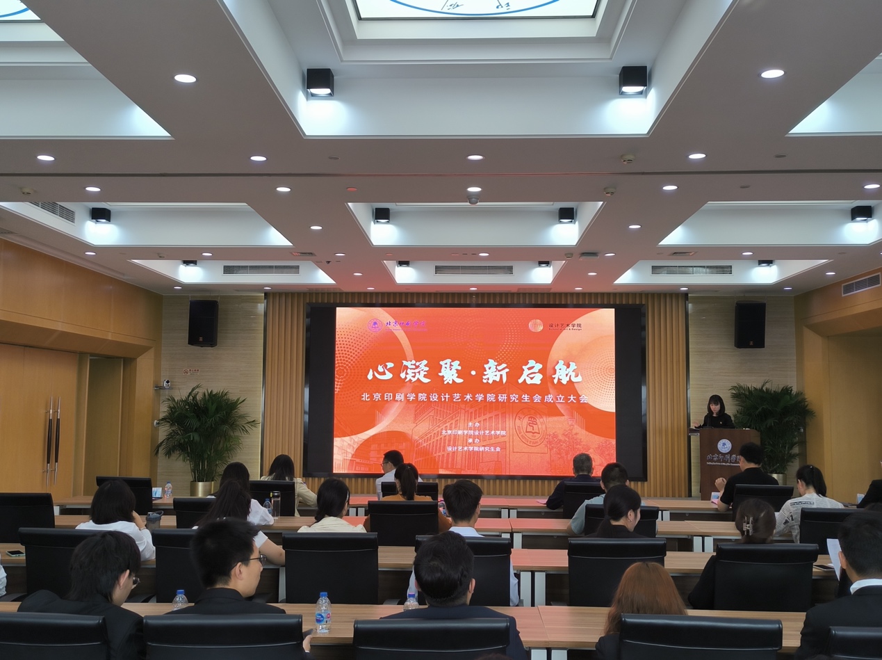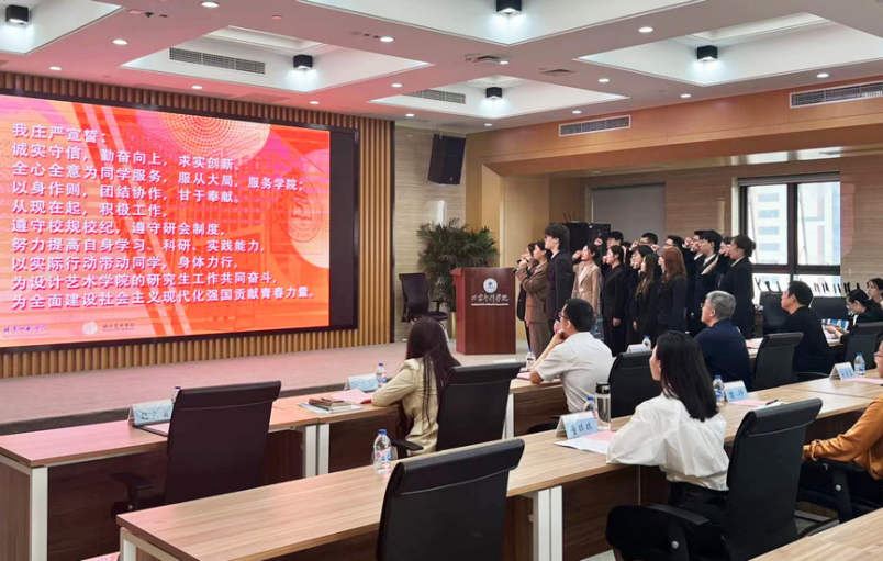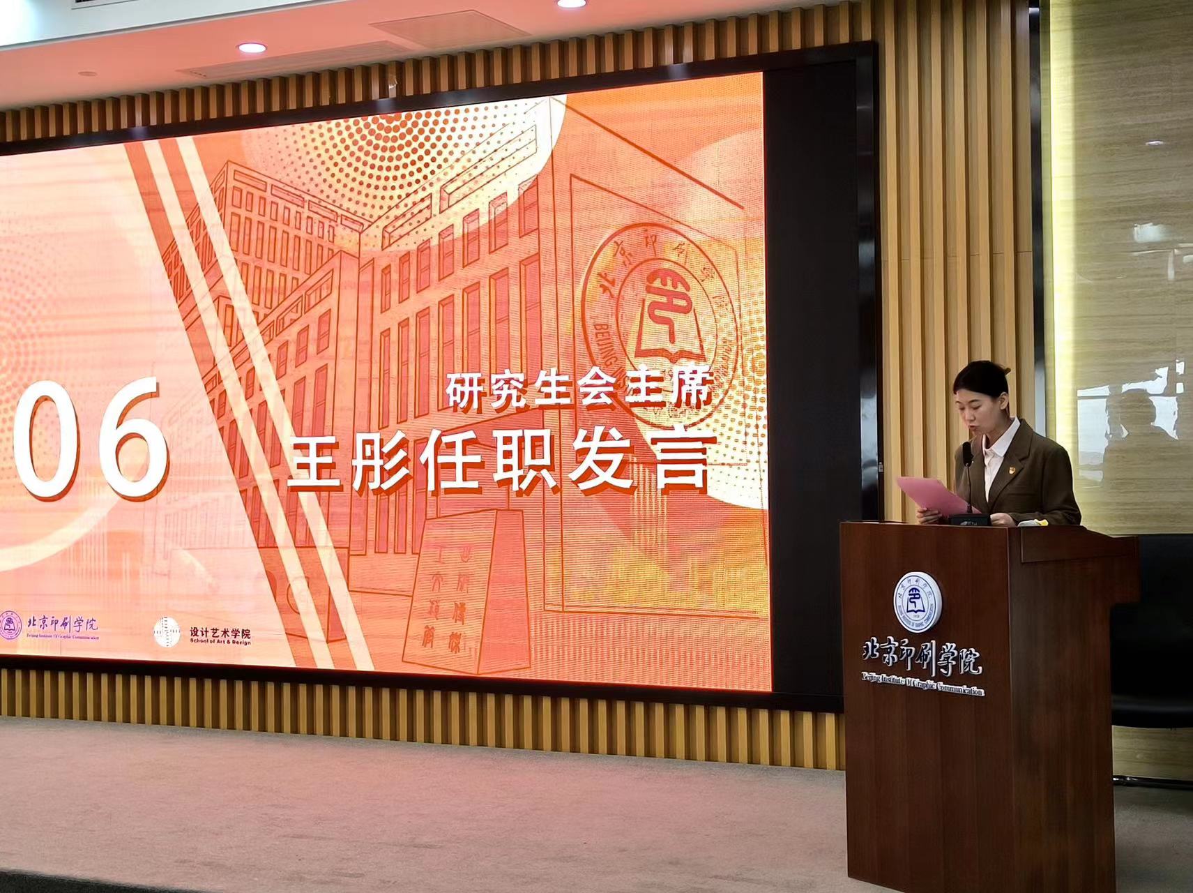 会议在庄严的国歌中拉开序幕,设计艺术学院副院长陶海鹰宣读了《设计艺术学院关于成立第一届研究生会的决定》,设计艺术学院党委副书记王蕊对设计艺术学院研会的成立表示了热烈祝贺并宣读了研究生会成员名单。北京印刷学院团委书记孙鹏为主席团成员颁发聘书。全体研究生会成员进行庄严宣誓,承诺将带领同学们做到团结奉献、求实创新、将各项工作做好做实、带好头、领好路。