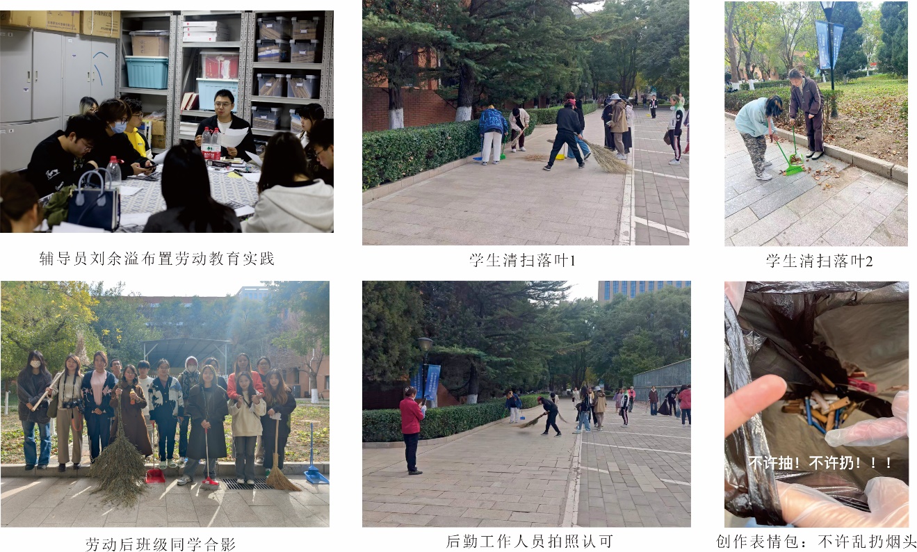 活动开始前,2022级辅导员刘余溢为各班班长召开会议,强调劳动教育的意义及要求,为各班明确劳动任务及具体安排。中午12点30分,2022级全体本科生前往任务区开展劳动实践,清扫落叶,捡拾杂物。劳动过程得到了现场后勤工作人员的充分认可。
