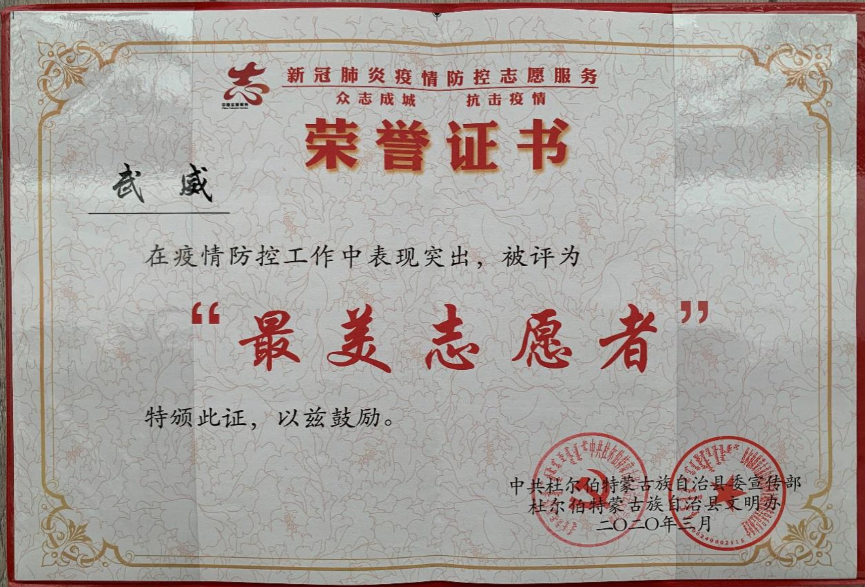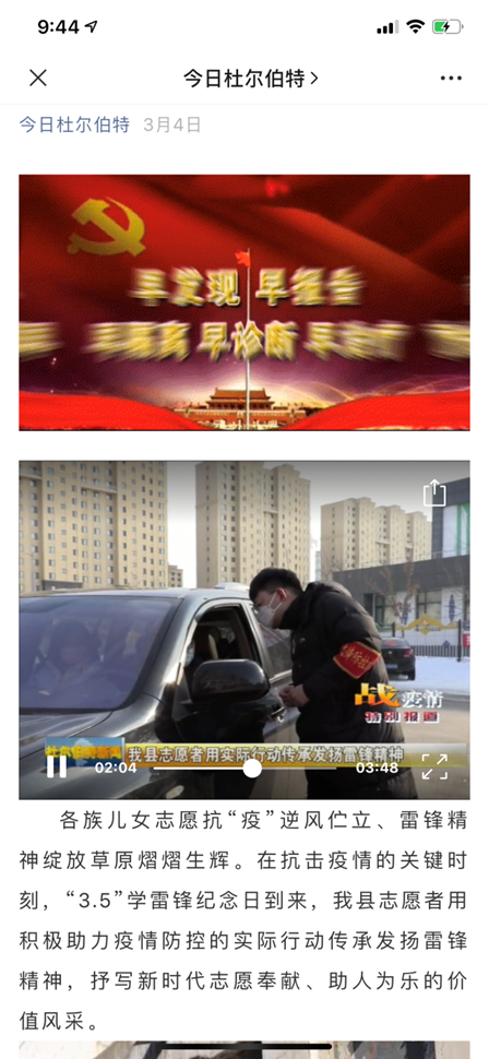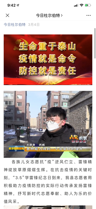 新冠状病毒疫情暴发后,16级展示2班学生武威,积极投入到黑龙江省大庆市杜尔伯特蒙古族自治县东郡悦府社区的疫情防控志愿服务中,在30天总时长300小时左右的服务中,他认真登记出入居民信息,经常向居民宣传解释防控政策,对居民进行心理疏导。他还经常帮小区居民买菜购物、收发物品、消毒消杀,参与慰问支援湖北医疗队家属,受到小区居民的一致好评。在3.5学雷锋纪念日,被当地电视台作为学雷锋模范专题报道。获得最美志愿者称号。