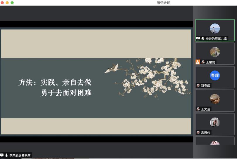 19级研究生李荣结合自己的乡村生活经历,以讲故事的方式表达了对《乡土中国》独到的见解。同时,他发自肺腑地对学弟学妹们提出期许:希望大家能够用实践、亲身去做,勇于面对困难。在疫情当下,鼓励在校同学积极配合学校的各项防疫政策,珍惜在校时间,不断充实自我,不负时代,不负韶华。