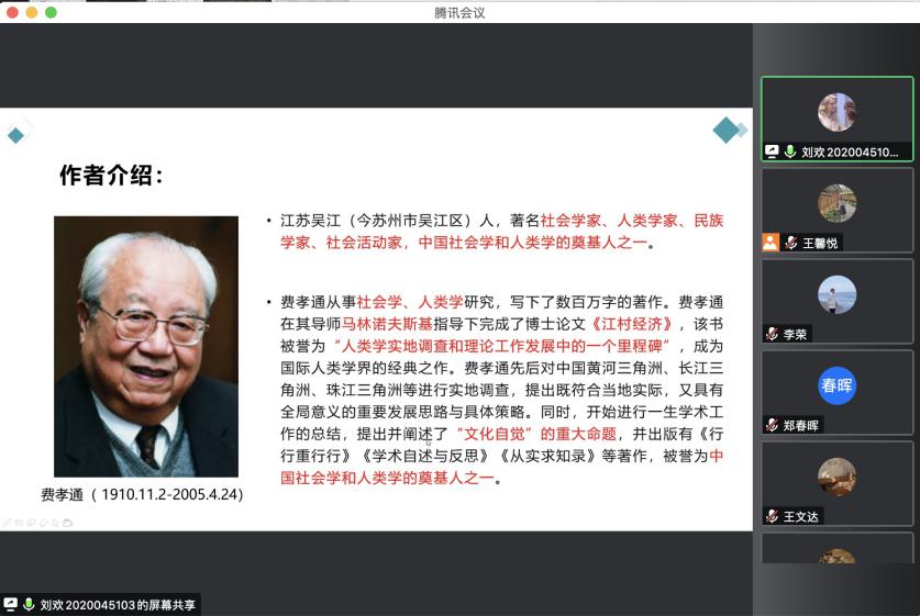 20级研究生刘欢从作者介绍、版本更迭、主要内容、创作动机和启示意义这五方面对《乡土中国》做了全面而细致的分享,她认为此书为今后从事与中国传统社会模式相关的艺术研究提供了重要的理论基础,同时通过该书的深入解读,感悟到中国文化自信在不断增强,作为在校学生在学习之余还需时刻关注中国发展中的具体问题,正如习近平总书记在纪念五四运动100周年大会上所讲“新时代中国青年要担当时代责任”。
