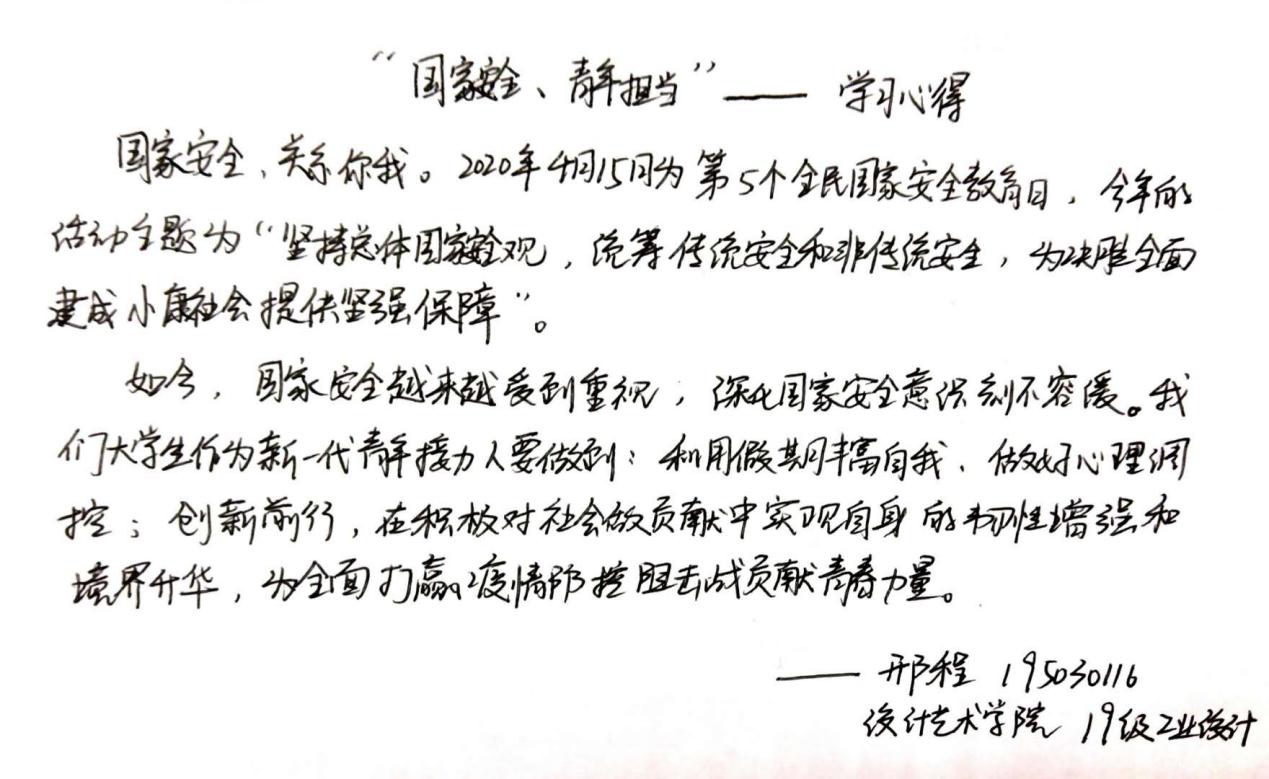 为切实提高学生国家安全意识,学院组织学生观看“2020年全民国家安全教育日”高校公开课,组织全体学生参与中国大学生在线开展的国家安全知识在线问答;积极发动学生开展国家安全知识的线上讨论、主题班会、党团活动等“云交流学习”,引导带领学生观看学习相关的国家安全法律法规,结合疫情防控工作进行学习交流,畅谈学习体会;征集对国家安全、抗击疫情、科学防疫等内容的手写文字和绘画作品等。