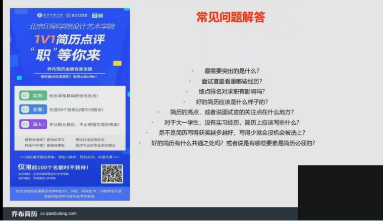 她还以同学乔小堂为例,讲述了怎样把自己的简历写的“独树一帜”,体现自己的核心竞争力,怎样将个人能力与岗位需求相匹配,如何挖掘“加分经历”写出亮点等。