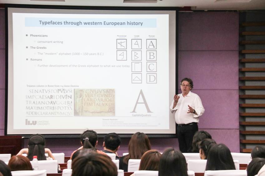 Tommie NystrÖm教授首先介绍了瑞典林雪平大学的基本概况。之后介绍了西欧的字体排版,西方字体的历史和演变,分析总结了西欧古典书籍中的字体设计规律,以及现代广告中字体设计的运用。Tommie NystrÖm教授指出优秀的设计作品能够吸引读者兴趣,帮助读者快速准确的获取信息。Tommie NystrÖm教授丰富的学识、精炼的语言、诙谐的风格使得整场讲座不时传来笑声和掌声。