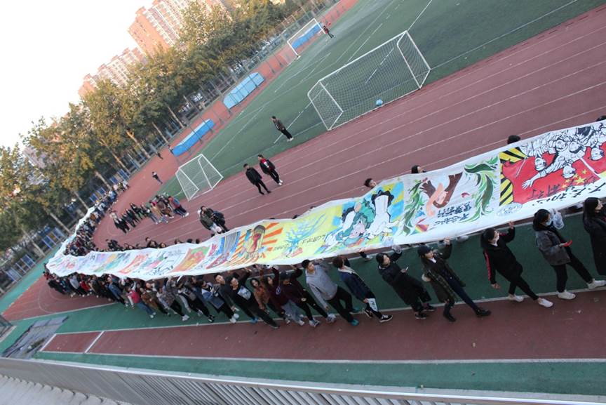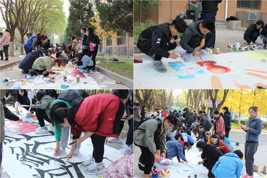 深秋的寒风丝毫没有影响到活动现场火热的氛围,同学们活跃在百米的画布上,围绕着“科技创新”、“ 一带一路”、“ 反腐倡廉”、“绿色发展”等一系列十九大重要主题,用自己那颗炽热的心与手上那灵动的画笔,以高度的专业素养和高超的绘画技巧勾勒出对中华民族伟大复兴的美好祝愿。