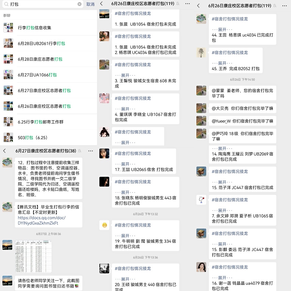 行李打包前期,毕业年级辅导员通过线上点对点的方式反复与毕业生核对邮寄行李的人数、物品清单及邮寄详细地址。在党委副书记王蕊、学工组长王馨悦和综办主任白文斌的有序组织下,建立每日打包工作群,保障教师和学生志愿者能随时沟通打包过程中出现的问题。在行李整理的过程中,老师们也全程与学生进行视频连线,逐一与学生确认个人物品位置数量、确认暂存与邮寄物品以及易碎品等打包细节,完成后宿舍负责人在工作群中接龙,确保学生个人物品安全、完整、顺利邮寄到每一位毕业生手中。