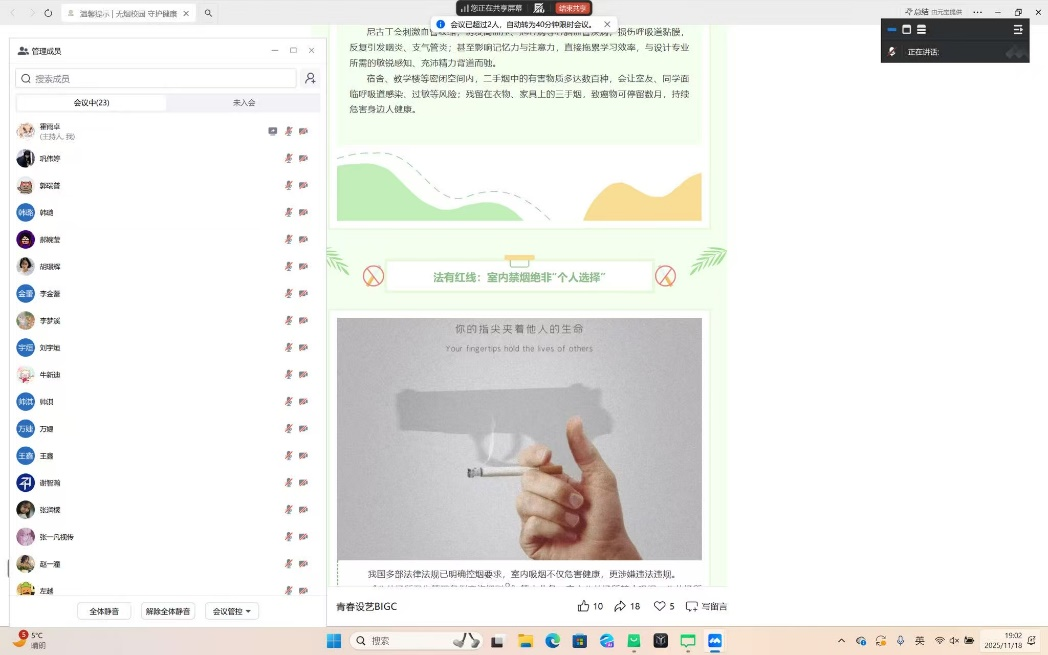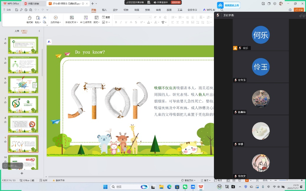 为积极响应学校建设“无烟校园”号召,全面提升研究生健康素养与文明风貌,11月17日,设计艺术学院以班级为单位,组织全体研究生开展“无烟校园,守护健康”系列主题教育活动。班会以线上形式举行,内容充实、主题鲜明,营造了清新健康的校园文化氛围。