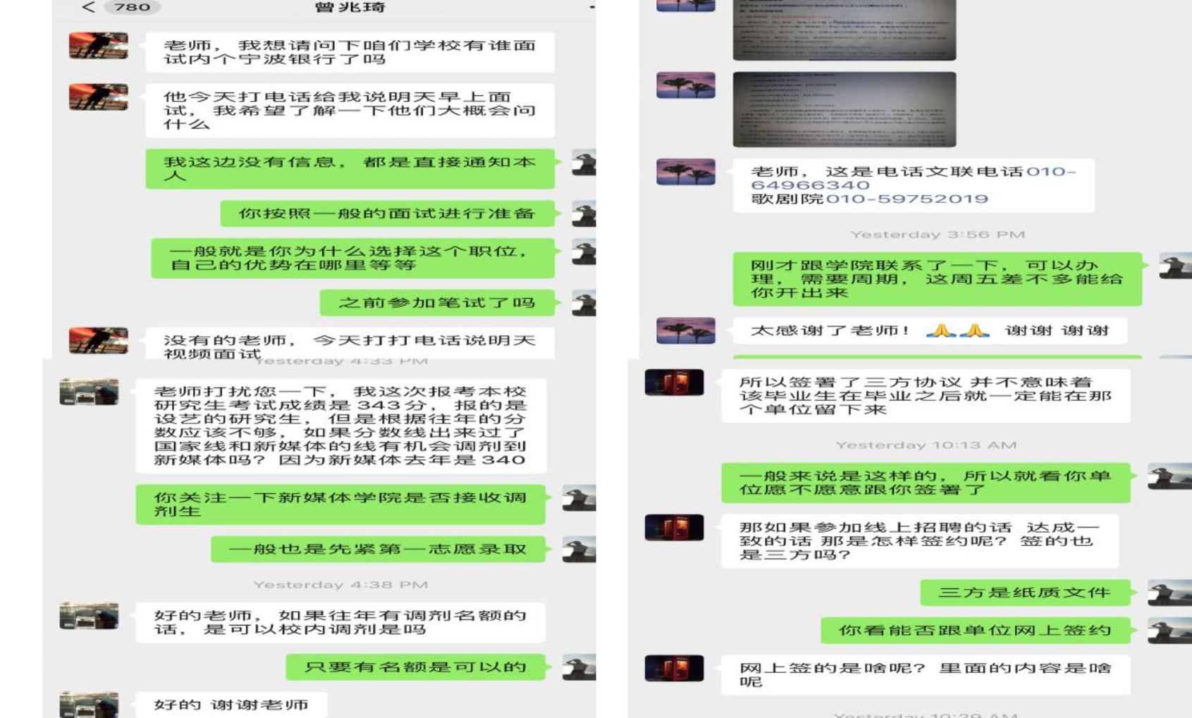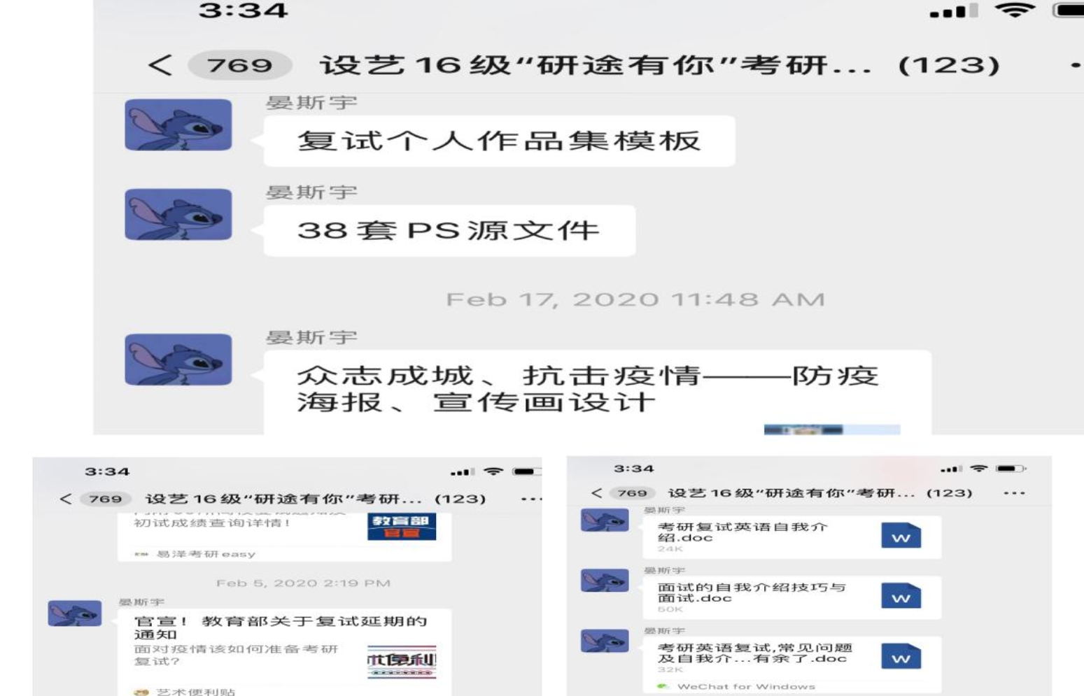 防疫期间,设计艺术学院针对毕业生进行了三次就业数据调研,第一时间掌握了毕业生目前的就业现状和就业需求,从而提供精准帮扶。如在考研成绩公布后,学院第一时间进行了考研学生的成绩摸底,对于处于不同分数段的同学给予不同的分类指导。对于上线的同学尤其是湖北籍考研上线的同学,鼓励其安心在家准备复试,对于分数线周围的同学指导其准备复试同时关注调剂信息,对于考研失利的同学,引导其消除焦虑,根据自身实际情况选择下一步目标。同时学院建立沿途有你考研交流群,由19级研究生学长晏斯宇在群中实时分享考研复试及调剂相关信息。