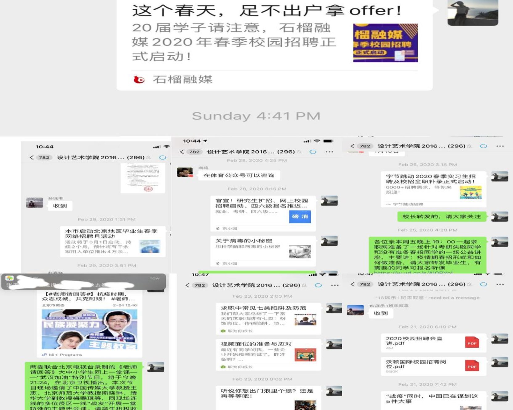 新冠肺炎疫情发生以来,设计艺术学院根据《新冠肺炎疫情防控期间北京高校毕业生就业工作方案》要求,认真落实学校关于疫情防控的各项工作部署,主动打造毕业生就业工作新模式。充分发挥网络优势,将工作由线下转至线上,做到就业支持不下线、就业服务不打烊、就业指导不停歇,全力做好防疫期间毕业生就业工作。