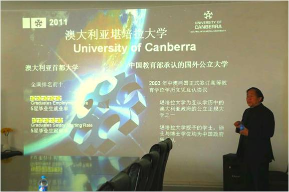 为了方便学生进一步了解我校与国外学校合作交流办学的具体内容和特色招生选拔要求,4月3日下午,由国际教育学院主办,设计艺术学院承办的我校与澳大利亚堪培拉大学(UC)联合培养项目咨询会在E楼301举办。本次咨询会主要面向设计艺术学院有意赴澳学习的2014-2012级本科生,该项目负责人魏建新教授参加了会议。