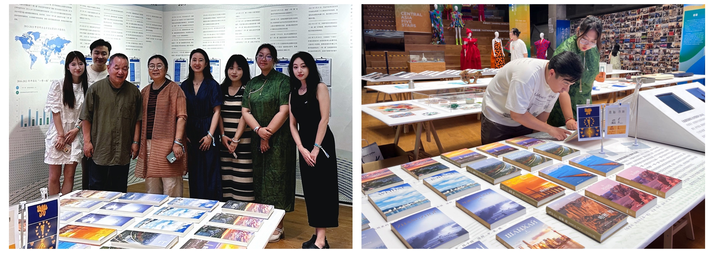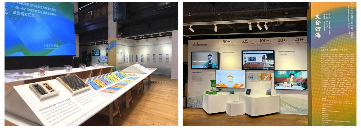 学校设计艺术学院张馥玫副教授作为“文合四海”子版块负责人,带领研究生团队,联合宁夏大学、中南出版传媒集团、外文出版社、五洲出版社、智慧宫、五洲传播中心等单位共同完成本次展览。“文合四海”版块通过“大事记”“主题出版”“一地一策”“智娱共享”“文化联接”“多向融通”等6个主题展现“一带一路”高质量共建中出版传媒活动对文化艺术传播的重要推动。国际教育学院副院长方一组织的2024未来国际出版人研学营、张舍茹教授团队策划的《华夏文明之窗》系列教材与网络课程、新媒体学院高妍玫教授带领团队主创的《黄帝战蚩尤》书法动画在本次展览上展出。