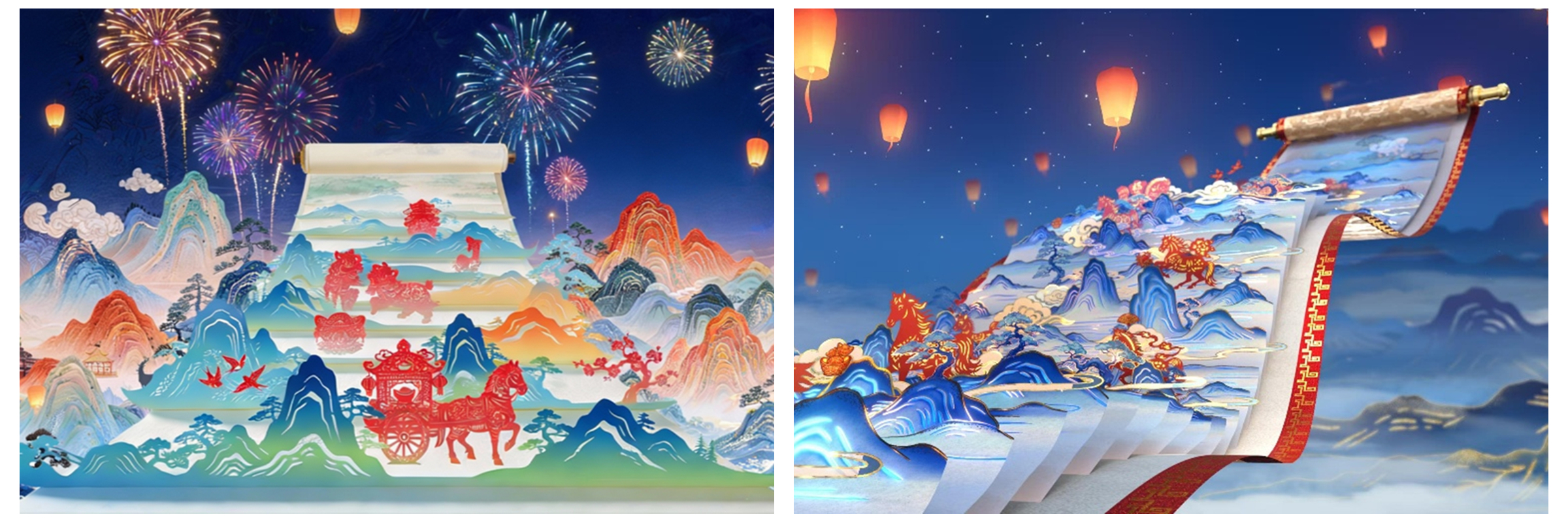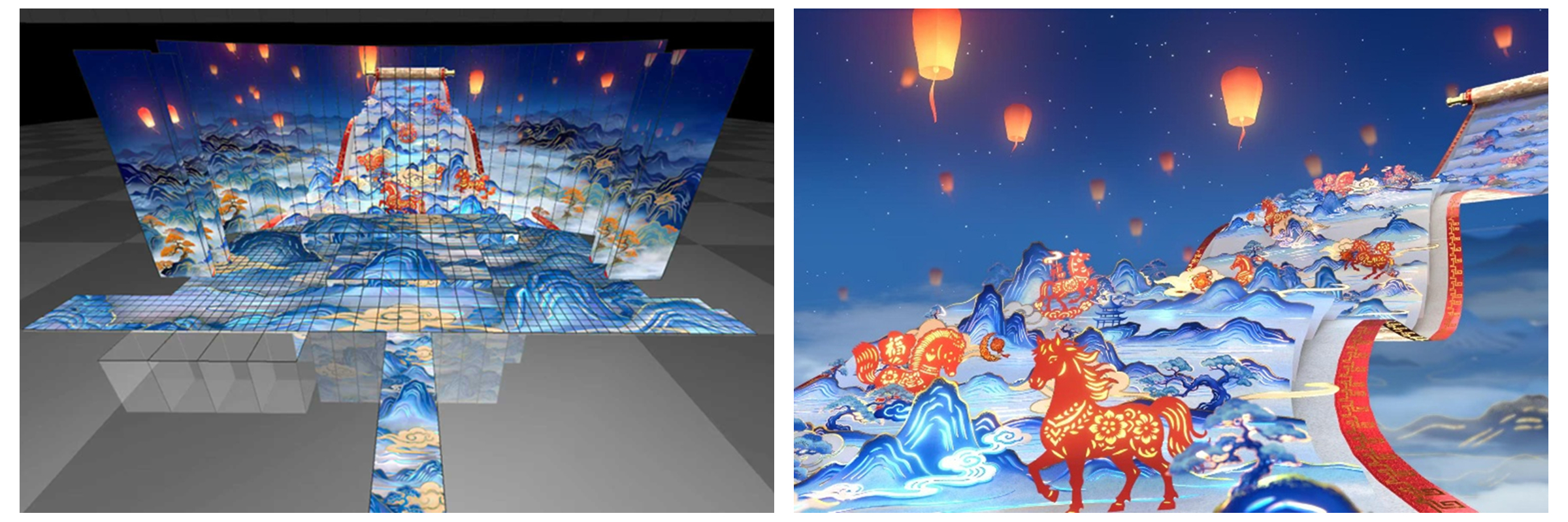 在《难忘今宵》方案推演阶段,学生围绕多条视觉路径开展多版创意方案,其中一版以非遗“龙鳞装”的层叠结构为意向,结合纸张动力学模拟与祖国山河、传统剪纸等意象的光效组织,进而提炼出可用于后续推演的空间运动语言与画面构成逻辑。