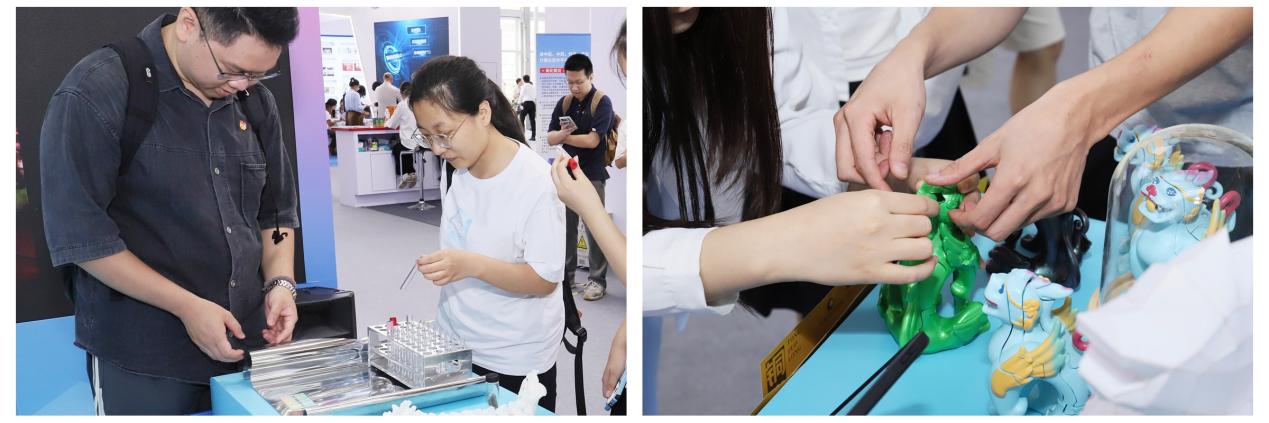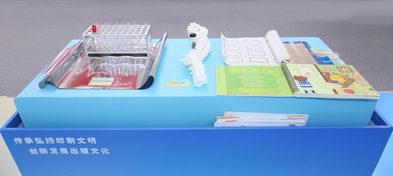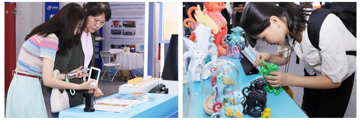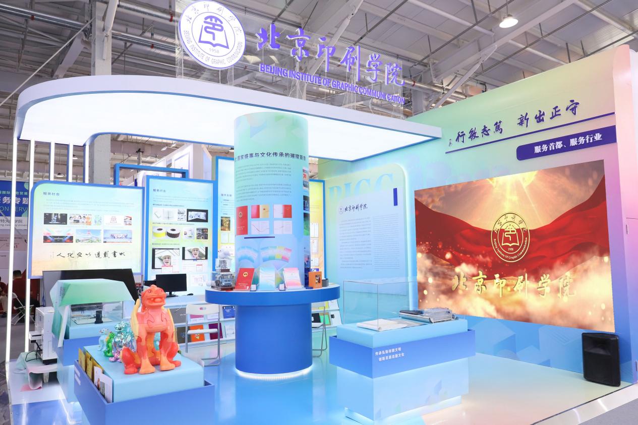 学校展台展出了可食用油墨、微纳结构色、满铺隐形防伪二维码、等离子体物理高阻隔薄膜、印刷电子关键核心材料及其应用产品、3D打印骨修复体等科技成果,以及学校服务国家重大活动的设计作品、数字多媒体出版物等展品。体现了学校科技创新服务培育出版印刷领域新质生产力、开放办学服务“一带一路”倡议、发挥学科专业优势服务文化强国和北京“四个中心”建设等特色成果。互动体验区展出了“铜坐龙”IP文创,供观众体验中国传统榫卯结构拼插,还展出了可食性油墨技术应用,供观众在现场参观品尝现场制作的带有个性化装饰的烘焙食品,吸引大批观众驻足参观体验。