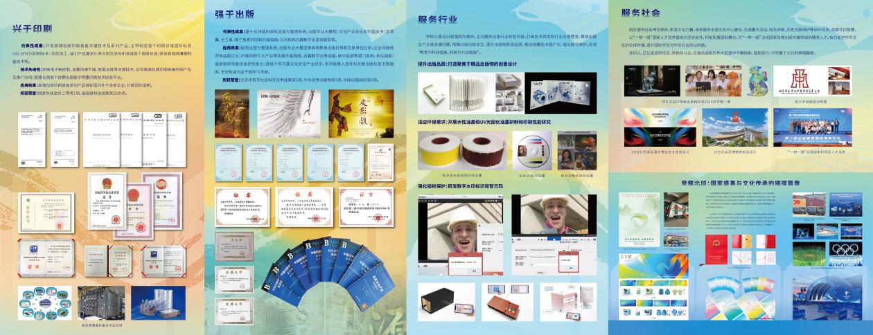学校展区展板分为学校简介、学校服务国家重大活动、服务出版与印刷行业、服务社会五大部分,主要介绍了学校扎根行业、立足北京,发挥在出版与传播、印刷与包装、设计与艺术三个领域特色优势,服务经济社会文化发展的科技创新成果和文化创意设计作品。