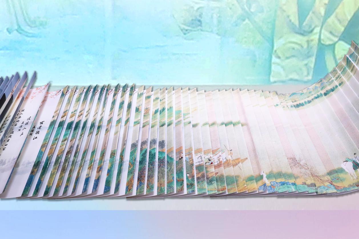 《人间百态》(龙鳞装)龙鳞装是古代几近失传的一种装帧方式,它“逐页翻飞,状如龙鳞”,不仅大大缩短了古代书卷的长度,也增添了阅读的趣味:书芯两侧皆为图画,正面为电脑制作的山水图,背面为古风《浔阳送别图》,可正读,可反观,为书中的诗词衬托出优美的意境,本作品曾被《人民日报》报道
