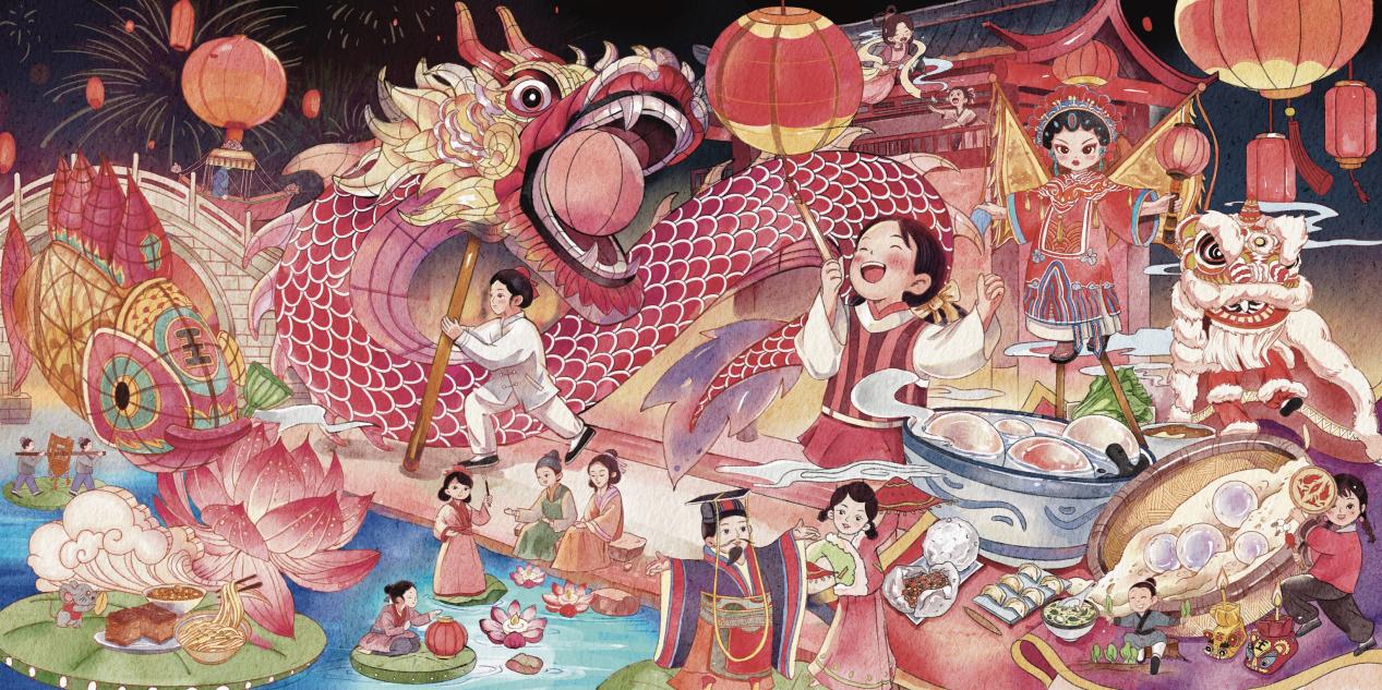 作品《上元夜景图》描绘了元宵节夜晚的丰富色彩和深邃背景。通过不同层次的场景展示了元宵节的起源典故,民间习俗以及食俗,如闹花灯、猜灯谜、舞龙灯、吃元宵等。这些元素交织在一起,形成了元宵夜温馨祥和的节日场景。通过这些场景描绘,向观众传达元宵节丰富的文化意义和节日氛围。