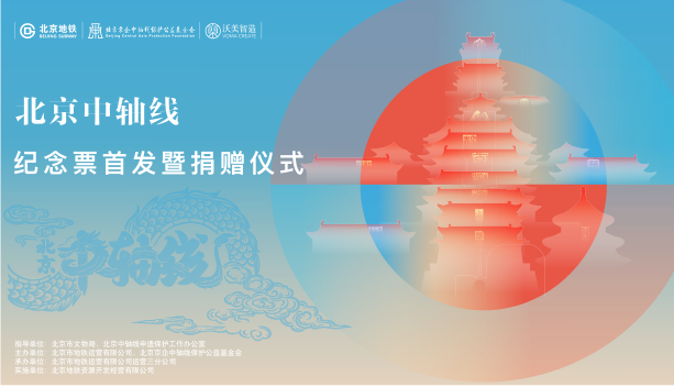 除此之外,团队还为北京中轴线纪念票首发暨捐赠仪式设计了主视觉。以北京中轴线文字与中轴线建筑作为主要展示元素,文字部分以传统文化中的龙身贯穿,既突出古代中轴线象征只有皇家才能使用的龙元素,又包含了甲辰龙年的含义。建筑剪影按照上北下南的顺序进行排列,整体构成了一个中字。