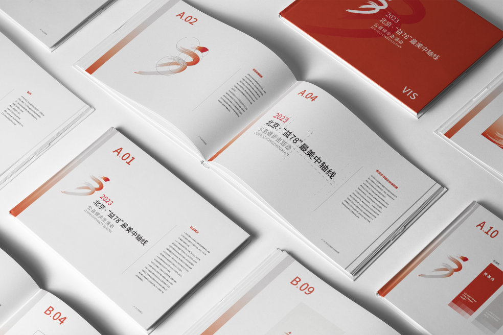 本次“中马”主视觉标识跃动中轴由余文婷师生团队完成最初版本演变而来,最初由团队为“北京‘益78’最美中轴线公益健步走活动”进行了品牌设计,包括标志设计、字体、颜色、品牌延展等。其中以标志为核心,标志以“跃动·公益”为中心,以人为主体进行设计。在结构方面,标志数字7、8为核心元素,通过解构数字8,将数字7与之融合,团队始终坚持以人体为框架,突出公益活动以人为本的宗旨。因此,在标志中特别选用运动员起跑时的姿势,此时的姿势最有力量,最有冲劲,最有气势,寓示着北京中轴线拥有无限的活力与创造力。 在元素构成方面,标志整体笔划均以毛笔飞白的方式展现,透出北京中轴线厚重的历史和文化底蕴。在配色方面,标志以映晨丹、瓦素灰为主配色方案,映晨红取材于清晨太阳初升,由地平线为底映射向整片天空的红色,以此突出表现标志的出现;瓦素灰取材于北京中轴线上民居灰瓦灰墙和现代灰白色高大建筑,融汇传统和现代的视觉习惯,为人们提供了良好的联想契机。