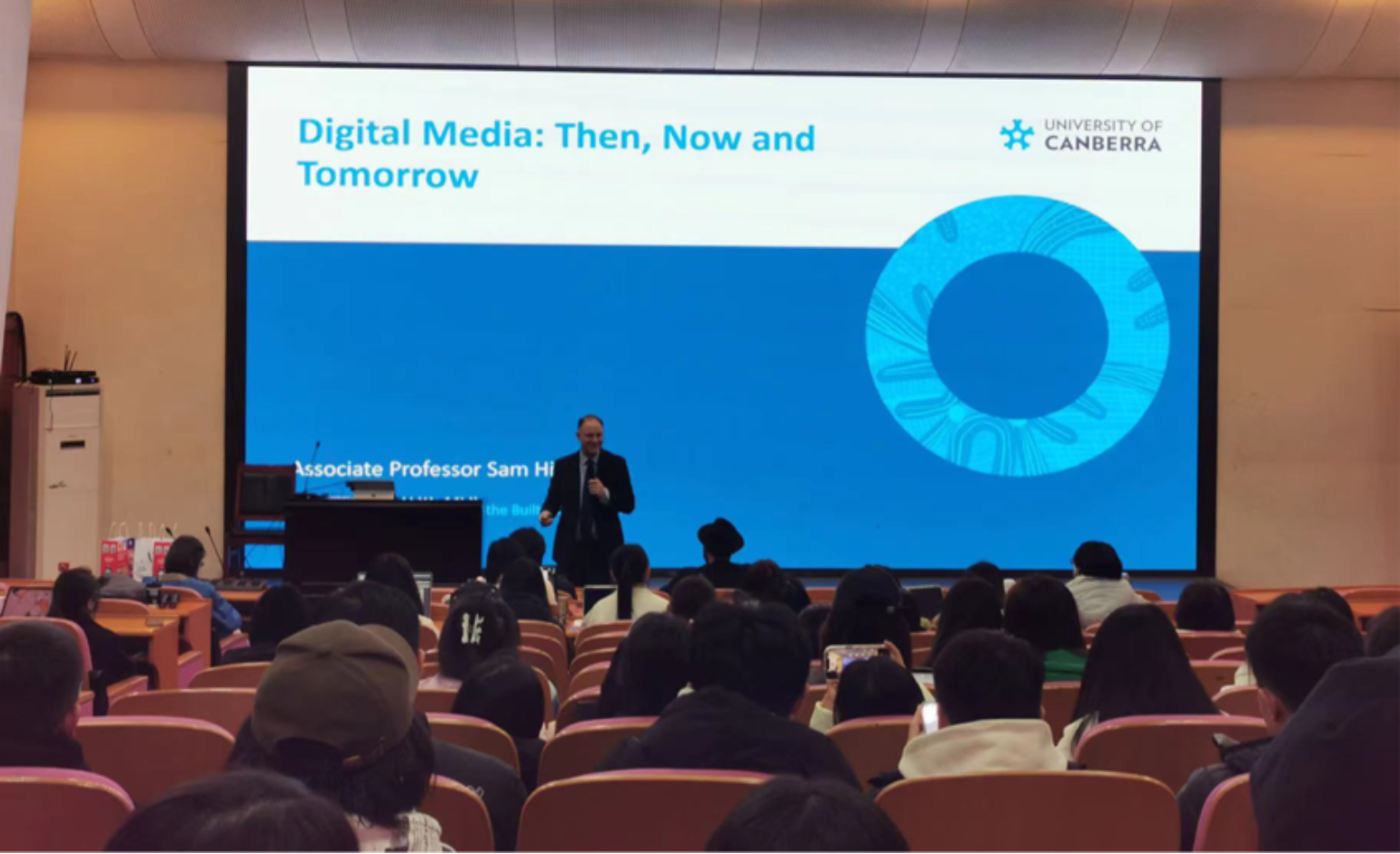 座谈交流后,山姆辛顿博士为设计艺术学院研究生进行了以“数字媒体:昨天、今天与明天”(Digital Media: Yesterday, Today, Tomorrow)的主题讲座,讲座由设计艺术学院张晓东院长主持,研究生导师王硕进行现场翻译。山姆博士以其在艺术、设计与媒体领域的深入研究与教学经验,为我校学生呈现了一场生动的学术讲座。在讲座中,山姆博士首先回顾了数字媒体的历史发展,深入剖析了从萌芽期到蓬勃发展的全部过程,他以深入浅出的方式解读了人类与信息互动的变化及方式。在提问环节,山姆博士与同学们探讨了人工智能在塑造当今社会中所扮演的角色问题,以及变革中的技术对未来的潜在影响,受到广泛同学的互动与好评。