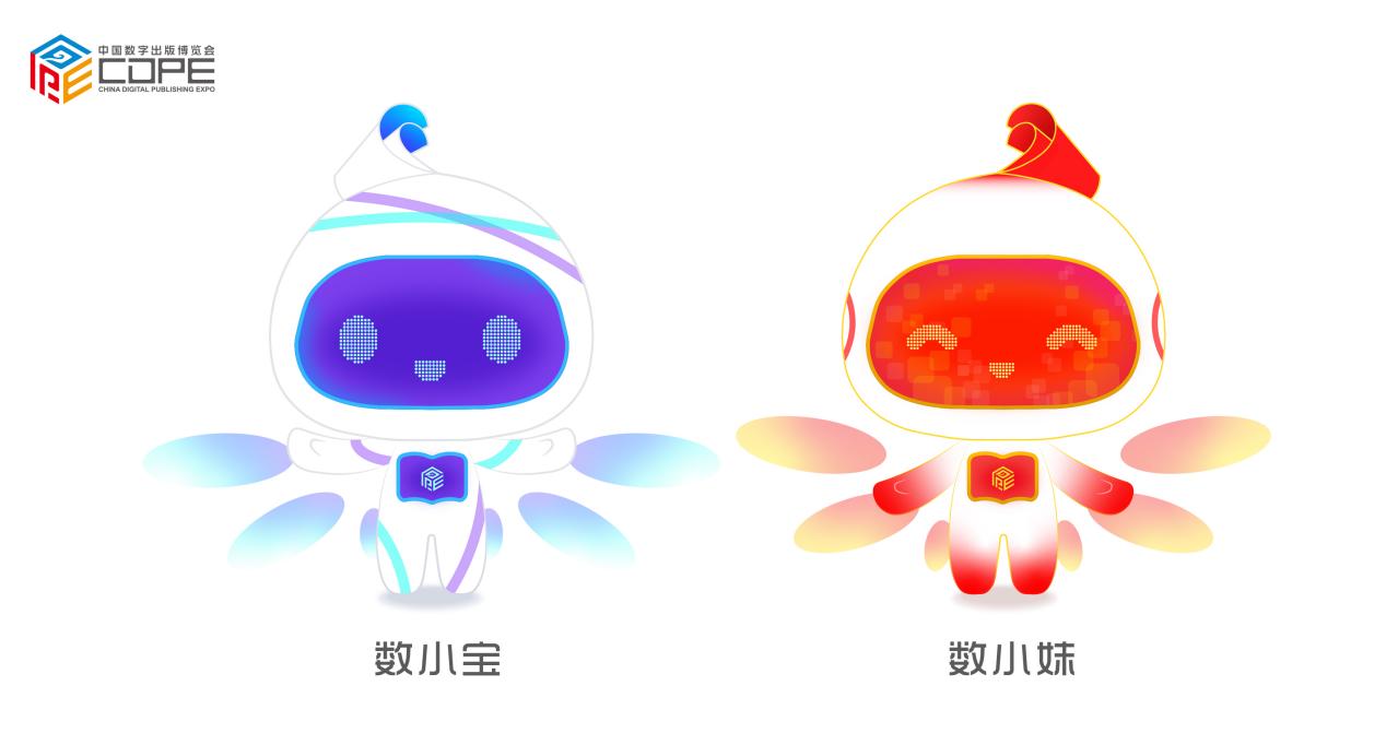 根据中国数字出版博览会的活动需要,设计团队对吉祥物的文化理念、设计理念、推广应用等进行大量调研,从需求定位、情感传达与文化认同性角度分析和总结了吉祥物设计的关键要素,为吉祥物设计思路的梳理提供了理论依据。过程中,设计团队对吉祥物的色彩、风格、造型和寓意进行了多种尝试与调整。吉祥物头部卷起寓意着出版行业的书页纷飞,身后张开流光溢彩的科幻光翼。“数小宝”周身环绕着流动的信息流彩带,体现了数字信息流动汇集;面部屏幕如同浩瀚的数据星空,蕴含着无限的可能性。“数小妹”的身体点缀着鲜艳的中国红,体现了中国数字出版行业在坚持传承中华优秀传统文化、革命文化和社会主义先进文化的进程中,不断讲好中国故事的使命和责任;面部屏幕为无数汇聚晶莹的像素粒子变化闪烁,体现出数字出版联结未来、汇聚人才力量、创就行业繁星璀璨的生动实践。设计形态活泼灵动,色彩明艳绚丽,体现了强烈的科技感与未来感。