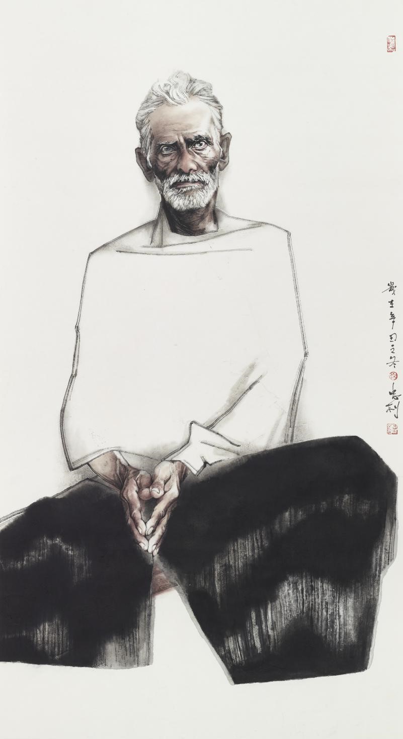 田忠利参展中国画作品《岁月》,将巴基斯坦人物作为表现对象,以中国传统水墨意趣、意象造型与“抟实为虚”“计白当黑”的美学理念为核心,融合西方绘画的造型观念,形成独特的艺术语言和表达方式。通过对人物形象脸部五官、双手及形体着装的不同处理手法,使人物形象既体现出“传神写照”的人文关怀,又呈现出“形神兼备”“气韵生动”的艺术效果。