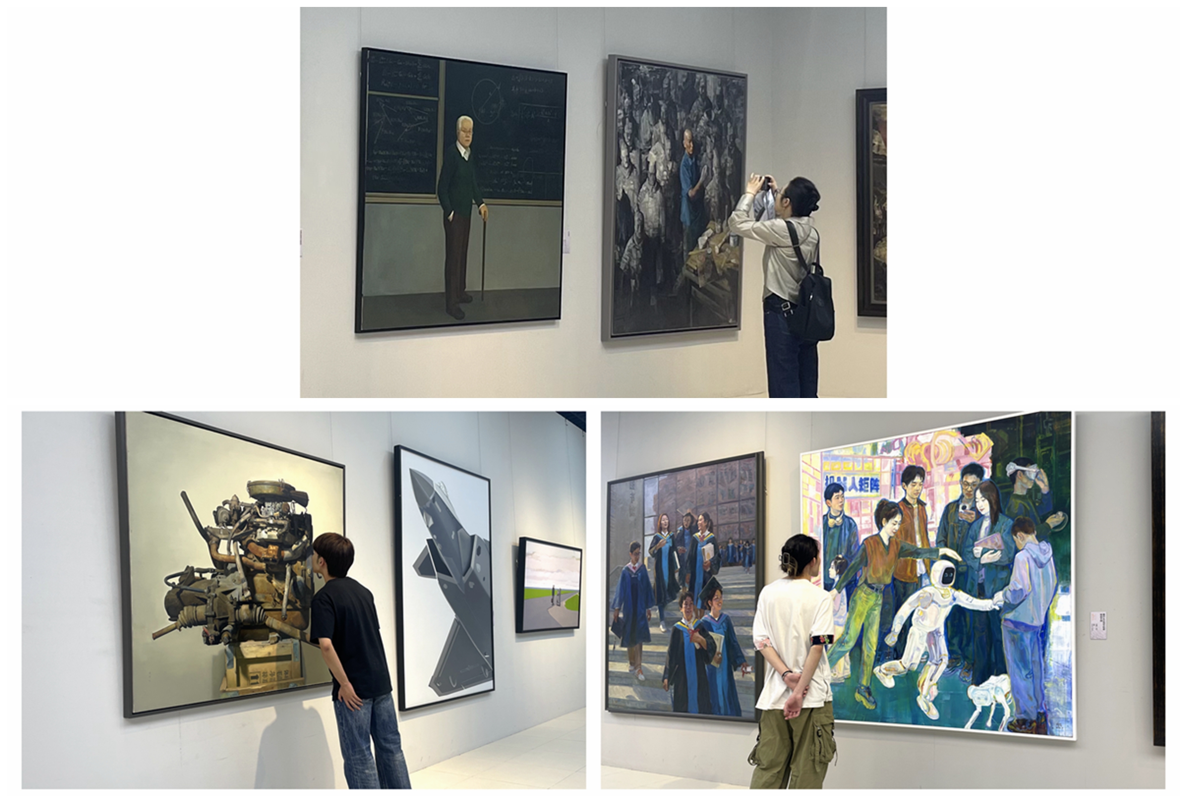 为庆祝中华人民共和国成立75周年,展现首都美术创作新成果,5月26日上午,由北京市文联、中国国家画院共同主办,北京美术家协会承办的“2024新时代首都美术展”在中国国家画院开幕。中国美协主席、北京美协主席范迪安,中国国家画院院长、中国美协副主席刘万鸣,中国美术馆党委书记、北京美协副主席安远远,中国美协分党组成员、秘书长王平,中共北京市委宣传部副部长、北京市电影局局长霍志静,北京市文联党组副书记、常务副主席马新明,中国美协插图装帧艺委会主任、北京美协副主席、学校党委副书记、院长田忠利等领导和专家学者参加开幕式。学校设计艺术学院三名教师作品莫沁杰的《大先生》、黄帅军的《父亲的荣耀》、许超的《是什么让当今社会如此不同》入选展览。