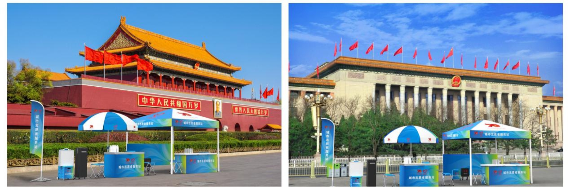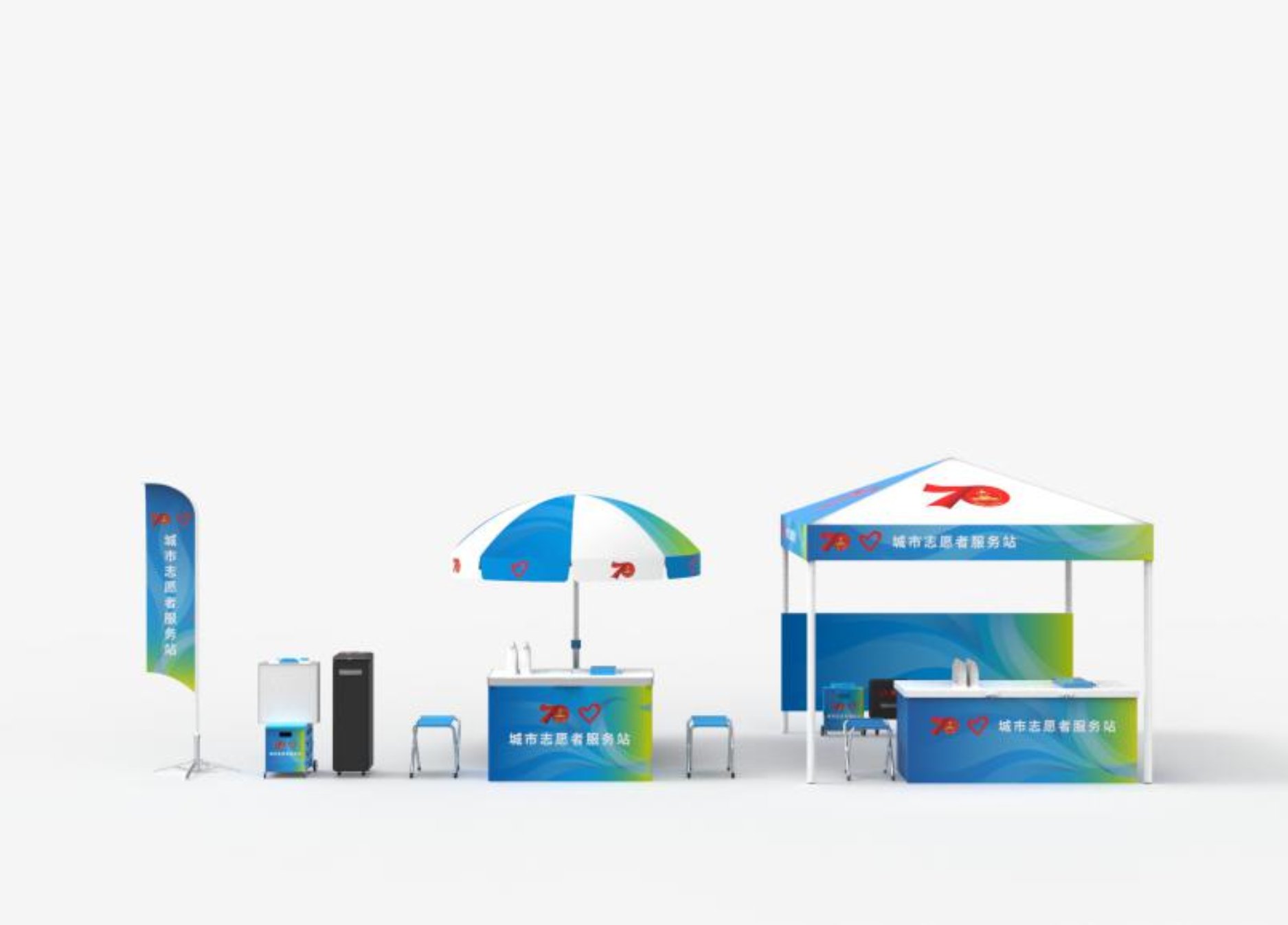 为做好本次城市志愿服务工作,国庆70周年志愿者指挥部以“志愿蓝”为基调,采用了由北京印刷学院设计艺术学院师生设计的以“志愿腾飞”为主题思路的城市志愿服务站标识系统。