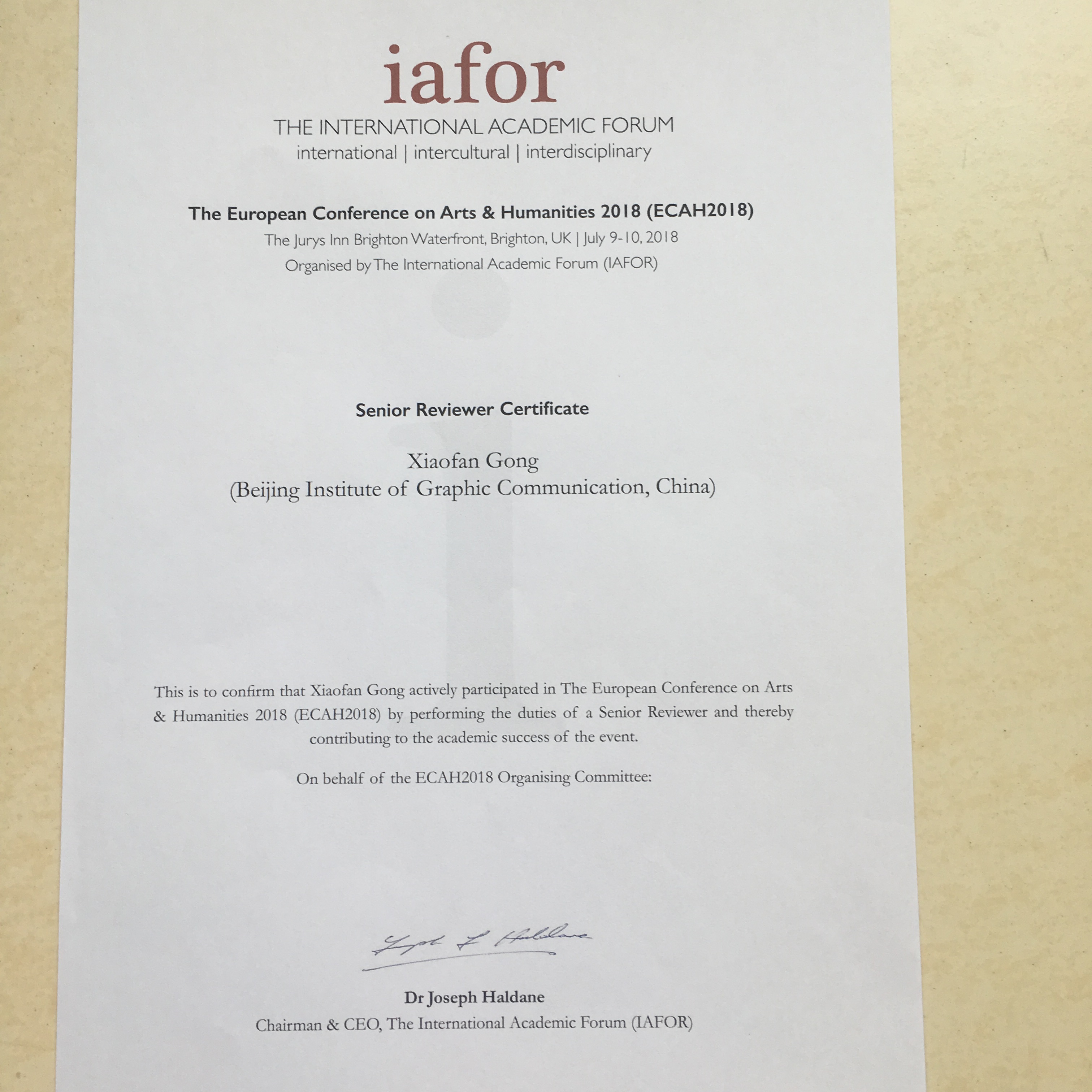 2018年暑期北印设计艺术学院龚小凡教授参加了于英国布莱顿召开的2018欧洲艺术与人文国际会议(The European Conference on Arts & Humanities,ECAH)。本次会议由国际学术论坛(The International Academic Forum ,IAFOR )主办,来自英国、美国、澳大利亚、加拿大、波兰、西班牙、南非、韩国、日本、中国等国的艺术与人文学科专家学者近百人出席了本次大会。此次会议的主题是“思考未来”( "Fearful Futures")。龚小凡教授提交了《中国创意市集——当代城市民间创意力量的集合地》的论文,并在艺术专题组宣读了论文。论文指出,创意市集是创意经济大潮中民间创意力量的一种“中国式创造”。原创性是创意市集的核心价值,创意市集是草根设计和平民艺术的众创空间,发展创意市集有助于当代城市新型创意空间的形成与城市新文化的发展。会前ECAH会议组委会邀请龚小凡教授参与了本次会议的论文学术评审工作,并在工作结束后向龚小凡教授颁发了资深评审证书(标注工作机构北京印刷学院)。会后龚小凡教授前往都柏林参观了爱尔兰国立印刷博物馆。