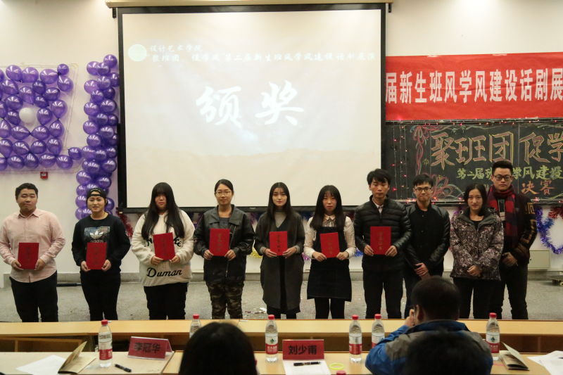 学院分团委书记曹进做活动点评。他指出,“聚班团·促学风”新生主题班团建设活动持续整个学期,同学们从建立班级、熟悉环境到团结创新、加强学习、建设班级,点点滴滴的努力和辛苦付出的汗水将设计艺术学院2015级凝结成了团结、向上、奋进的18个团队。在课程汇报展上,在班级建设日志上,在专业教师的点评中,甚至在运动会的赛场上,班级的良好班风学风都得到了淋漓尽致的体现。希望同学们以今天的总结表彰会议为起点,继续加强学风引领、丰富班团活动内涵,结合学院学风建设工作和“我的班级我的家”活动,在接下来的把班级建设成团结友爱、积极向上的港湾,发挥班级团结同学、共同进步的积极作用,收获能力提高、素质全面、学业有成的高质量大学生活。