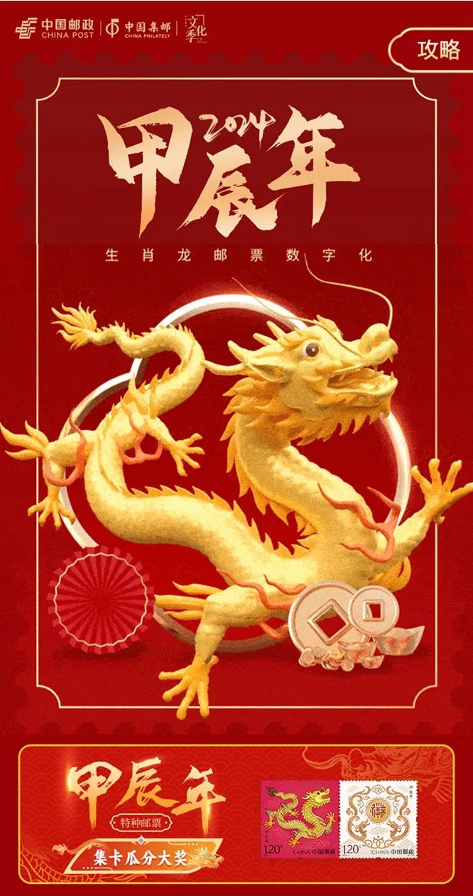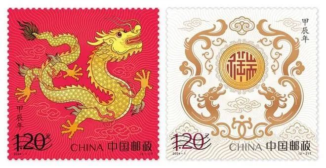 《甲辰年》特种邮票1套2枚,邮票图案名称分别为“天龙行健”“辰龙献瑞”。邮票第一图“天龙行健”展现了一条昂首奋发的金龙,象征蓬勃向上、自强不息的精神风貌,其形象和姿态源自故宫九龙壁,灵动宛转而不失敦厚威严,金龙身旁饰以寓意吉祥的火焰和祥云纹样并衬以中国红背景,展现出吉庆祥和、纳福迎祥的美好图景。邮票第二图“辰龙献瑞”图案源于中国传统吉祥纹样“祥龙拱璧”,画面整体与邮票外形构成“天圆地方”的格局,和谐而庄重,中央玉璧有“祥瑞”二字合文,寓意祥和圆满、福瑞安康,上方的如意纹样传递出和顺致祥之意,下方的水纹、云纹与龙形象共同展现了龙腾四海的宏阔景象,表达出风调雨顺、国泰民安的美好愿望。两枚邮票主打红、金、黑经典三色,体现出了大气、贵气、瑞气和喜气,一动一静、相得益彰。